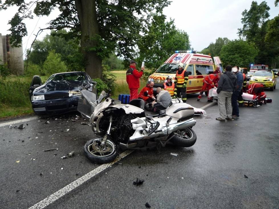 Celkem tři zraněné si vyžádala dopravní nehoda v Pertolticích na Frýdlantsku v pondělí 30.6., při které se srazil motocykl s osobním automobilem. Na motorce cestovali muž a žena.