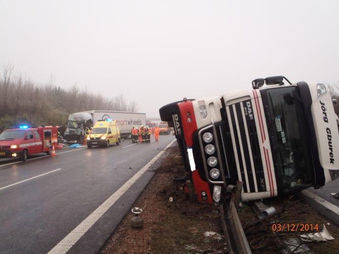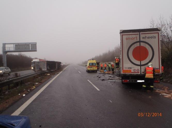 Dnes v 10.42 byla dispečinku linky 155 ohlášena dopravní nehoda dvou kamionů na 33. kilometru dálnice D5 směrem na Prahu.