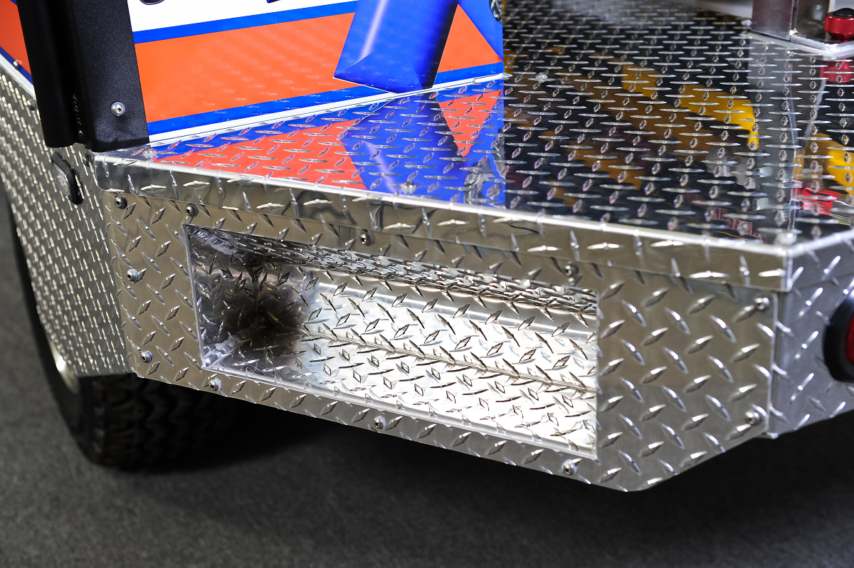 V kabině, která má střechu rovněž ze slzičkového plechu, je ovládání výstražného zařízení v podobě sirény, LED rampy a doplňkových světel, vše od firmy Whelen. Za předním nárazníkem je lanový naviják Warn o tažné síle 1360kg.