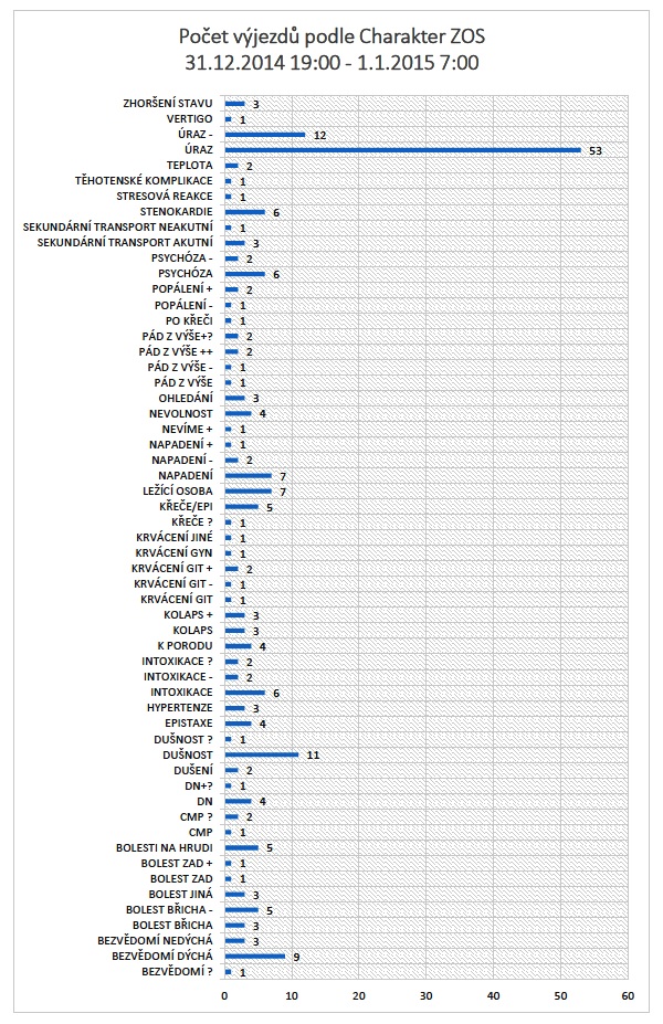 I letos převažovaly výjezdy posádek k potížím spojeným s konzumací alkoholu, řezným poraněním od střepů a úrazům způsobených zábavní pyrotechnikou. Za noční silvestrovskou dvanáctihodinovou směnu vyjeli záchranáři k 219 případů (185 případů loni).