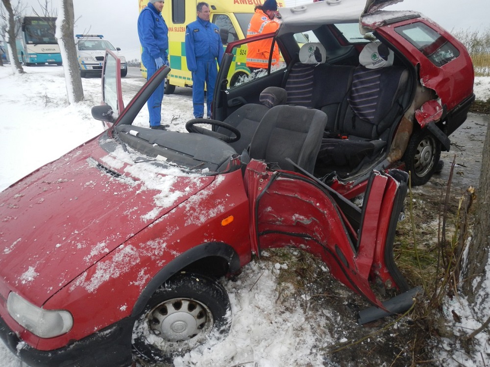 Průzkum na místě nehody ukázal, že se jedná o nehodu osobního automobilu tovární značky Škoda Felicia, který narazil do stromu. Uvnitř vozu zůstala zaklíněna jedna zraněná osoba. Zasahující hasiči ihned zahájili její vyprošťování. Pomocí speciálního hydraulického zařízení ostřihli postupně boční sloupky a následně odklopili celou střechu. Za necelou čtvrthodinu byla zraněná osoba vyproštěna a předána zdravotníkům. Ti ji do nemocnice transportovali letecky.