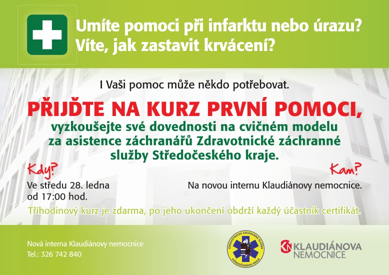 Ve středu 28. ledna 2014 od 17:00 proběhne školení první pomoci a neodkladné resuscitace v rámci projektu Učte se od profesionálů!, které se bude konat v Klaudiánově nemocnici, Mladá Boleslav.