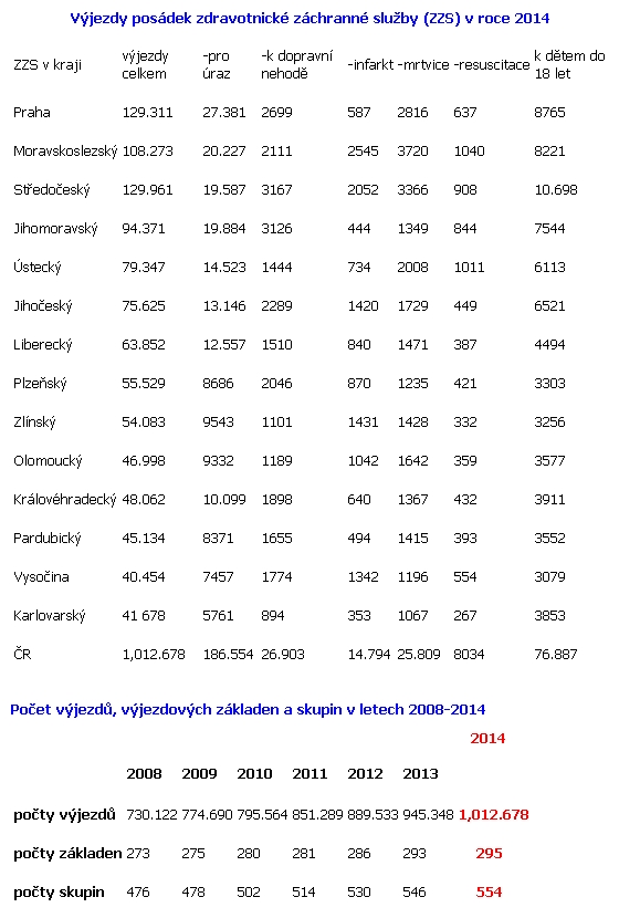 Ze statistik AZZS ČR lze vyčíst, že počet výjezdů ZZS v roce 2014 dosáhl 1 012.678 a rok předtím jich bylo „jen“ 945.348. Loni posádky například ošetřily 14.794 pacientů s infarktem myokardu, což je cca 1.700 méně, než v roce 2013, ošetřily i méně pacientů s CMP, kterých bylo statisticky vykázáno 25.809, což je o 3.400 pacientů s CMP míň než v roce 2013. KPR probíhala na 8.034 výjezdech a rok předtím na 8.483 výjezdech. O cca 13.000 naopak narostl počet výjezdů k úrazům na 186.554 výjezdů, ale zhruba o 1.600 méně výjezdů bylo k dopravním nehodám, loni jich bylo 26.903. Z celkového počtu výjezdů bylo loni 76.887 k dětem a 880.559 k pacientům starším 18 let.