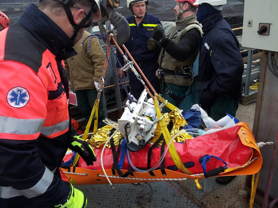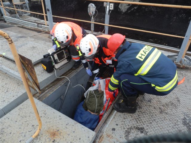 Na místo přijíždějí záchranáři ZZS KVK. Ve stísněných prostorách velkostroje se záchranářům podaří obnovit základní životní funkce a pacient je ve vakuové matraci a s připojením potřebných zdravotnických přístrojů dopraven na plošinu velkostroje. Je třeba zajistit transport pacienta z této plošiny do sanitního speciálu báňských záchranářů. Povoláni jsou tedy lezci báňské záchranné stanice, kteří pacienta připraví k transportu s využitím jeřábu umístěného přímo na velkostroji. Kvůli nepříznivým povětrnostním podmínkám však s ohledem na bezpečnost figuranta k samotnému spuštění nedochází.