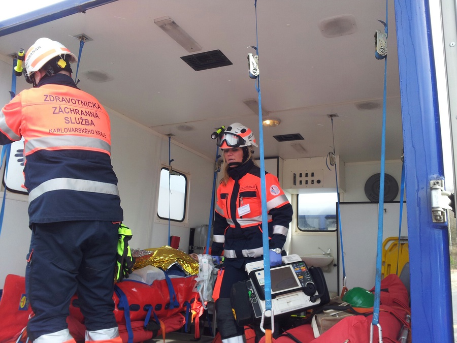 Po příjezdu na bránu Sokolovské uhelné si záchranáři přemísťují potřebné vybavení do terénního speciálu báňských záchranářů, kteří je dopravují na místo zásahu. Mezi tím přijíždějí k pacientovi hasiči Sokolovské uhelné. Ti přebírají poskytování první pomoci od kolegů pacienta a do doby příjezdu záchranářů ZZS v ní pokračují. Využívají k tomu i automatický externí defibrilátor a přístroj Autopulse, který provádí komprese hrudníku.