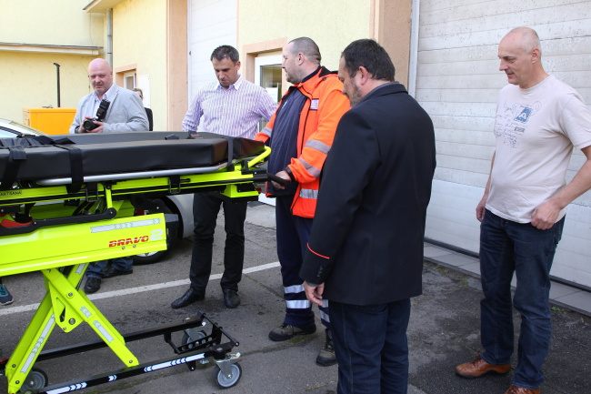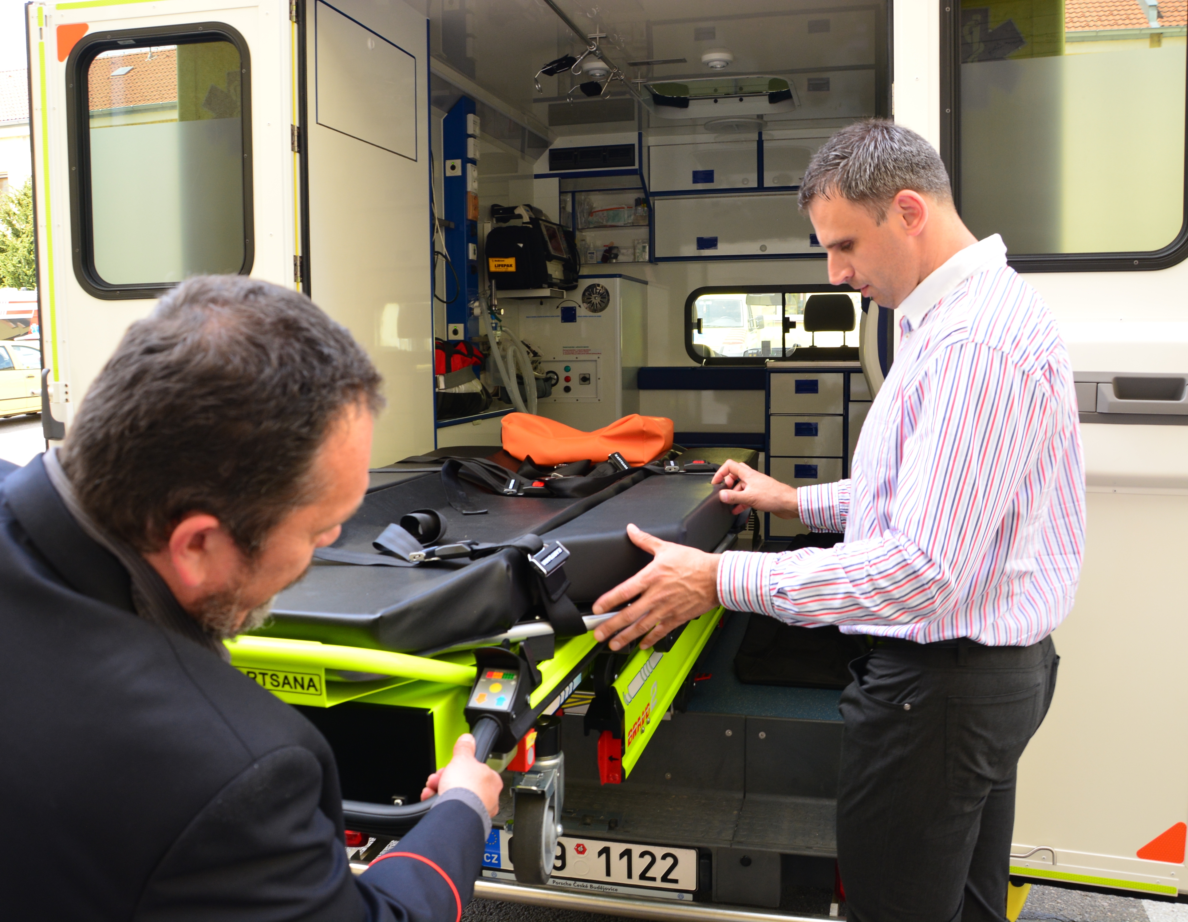 Ředitel ZZS JčK Marek Slabý ukazuje hejtmanovi Jiřímu Zimolovi vybavení nové sanitky