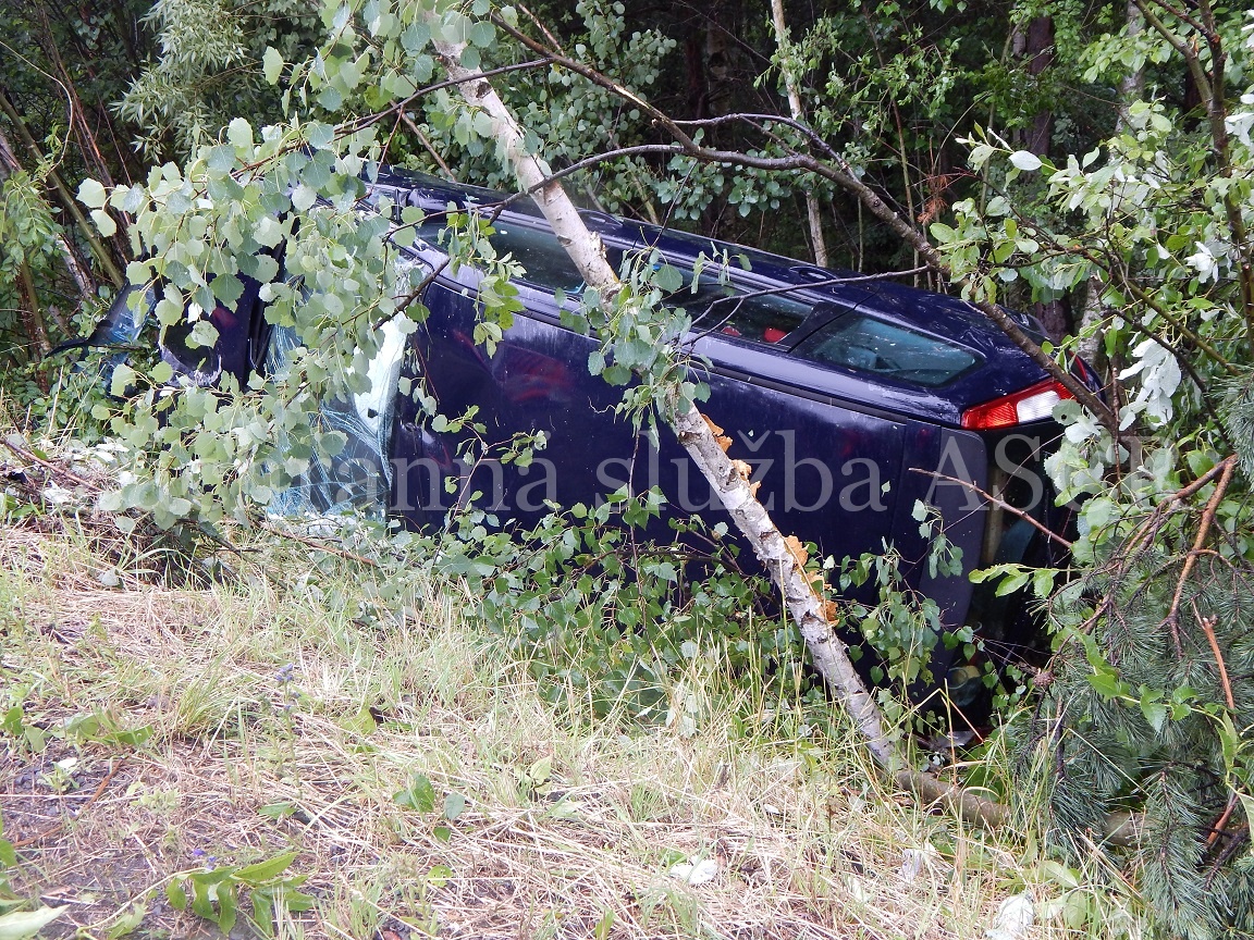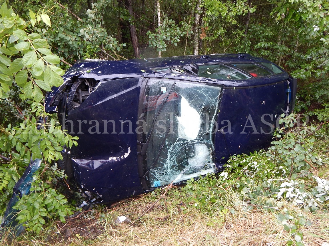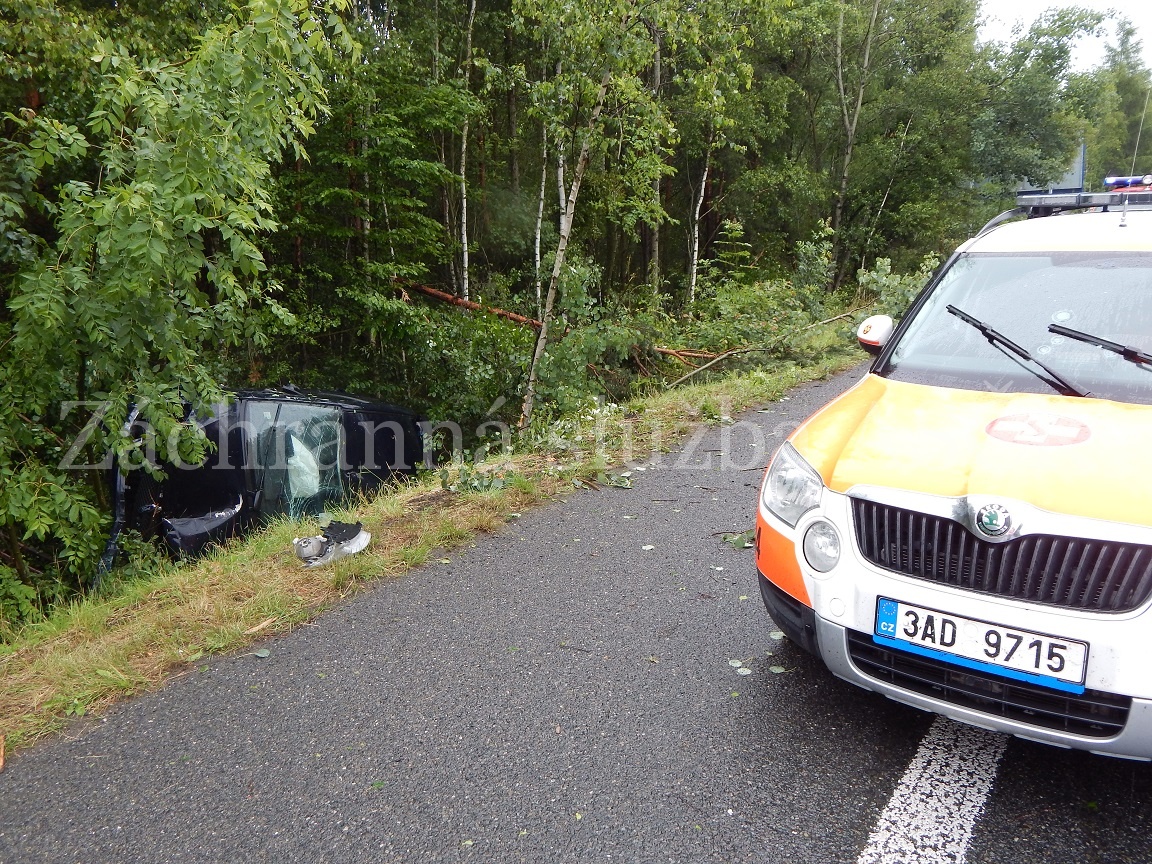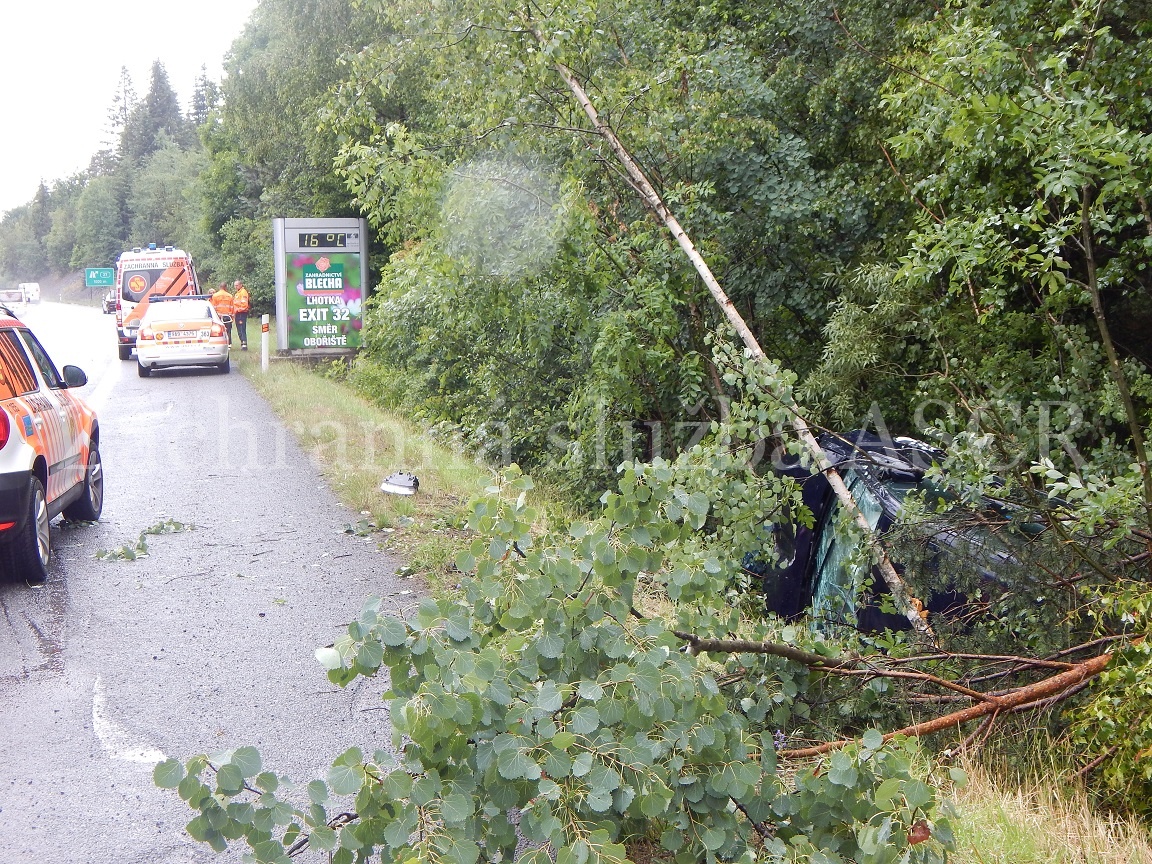 Při dopravní nehodě došlo ke zranění lehčího charakteru u řidiče osobního vozidla, které při nehodě prorazilo svodidla u pravé krajnice a skončilo havarované na boku v lesním příkopě.
