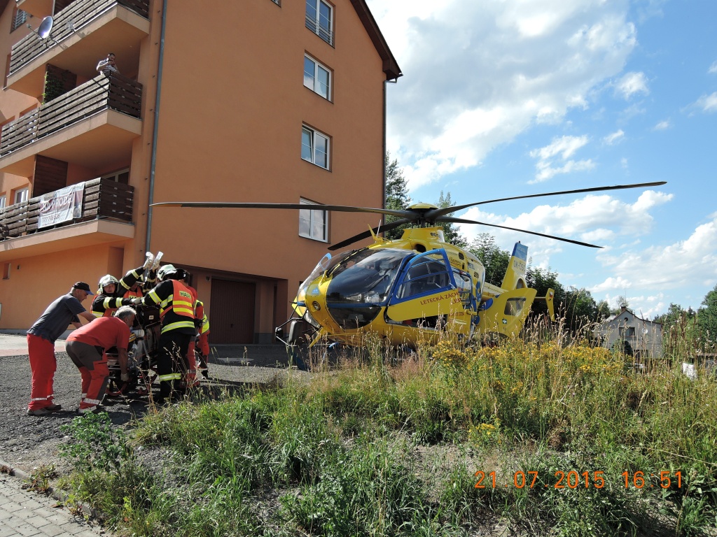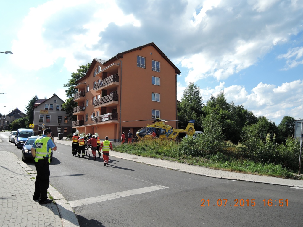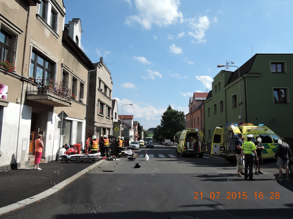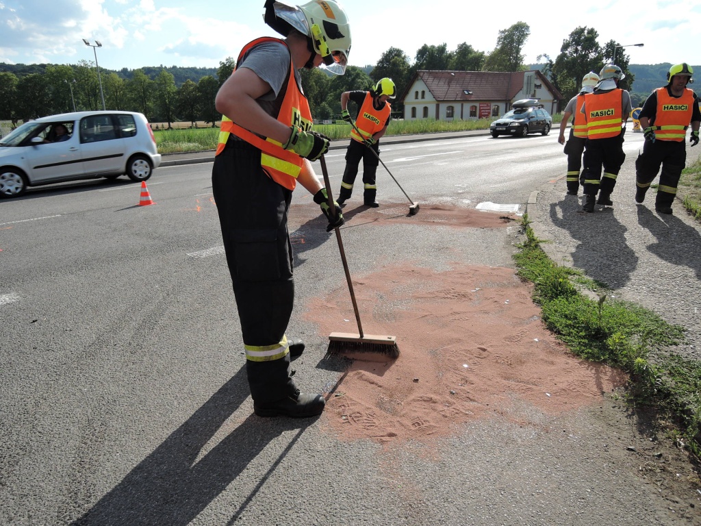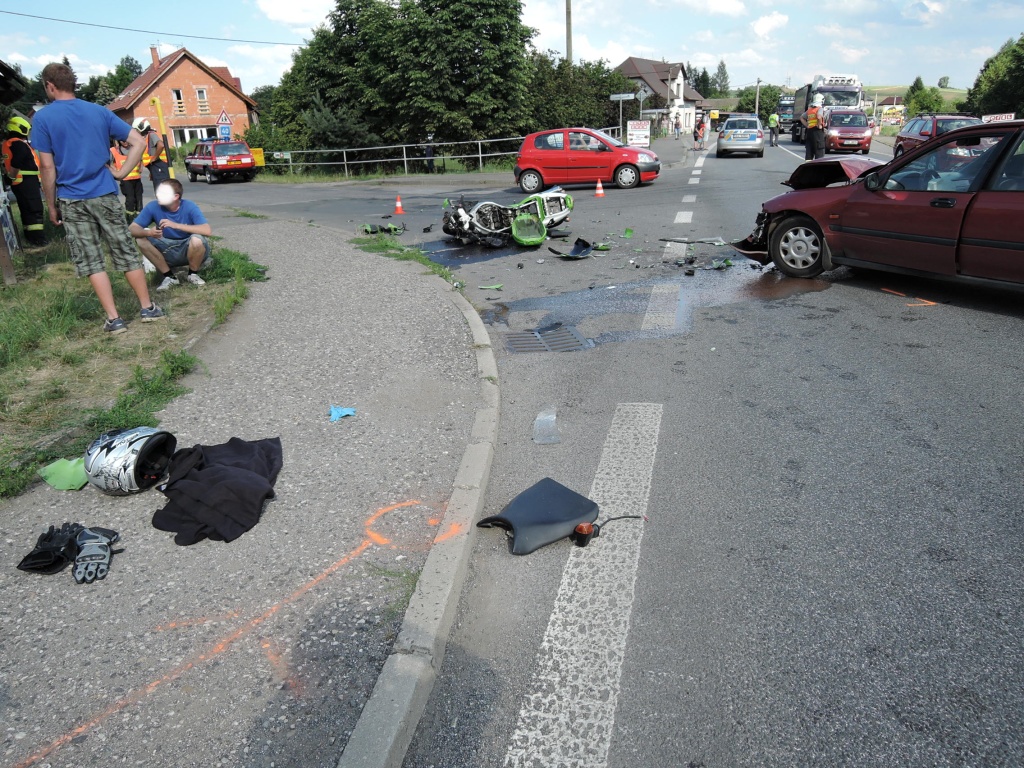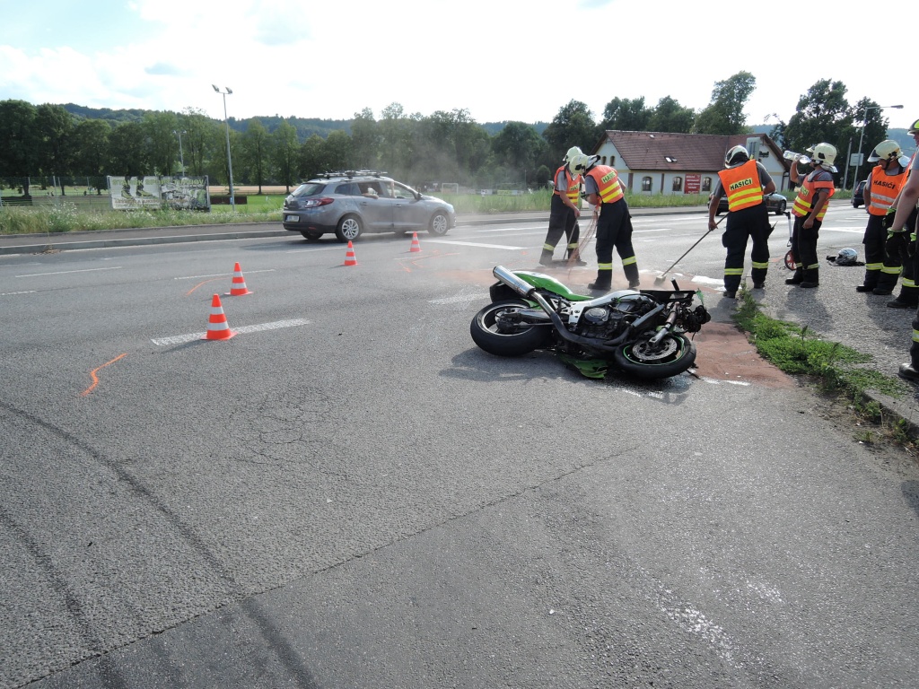 Jak hasiči zjistili, šlo o nehodu osobního automobilu a motocyklisty. Řidiči osobního automobilu se nic nestalo, motocyklista utrpěl zranění a lehce zraněna byla i kolemjdoucí chodkyně. Hasiči provedli protipožární opatření, provoz na komunikaci byl kompletně uzavřen. Jen z pacientů byl odvezen sanitním vozem ZZS, druhého zraněného hasiči pomohli transportovat do přivolaného vrtulníku LZS. Po zdokumentování nehody hasiči pomohli s naložením motocyklu na odtahovou službu a zasypali uniklé provozní náplně. Provoz byl obnoven těsně před půl osmou.