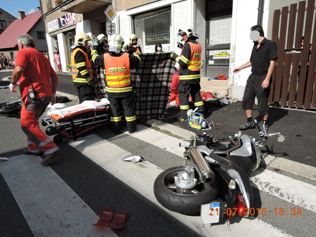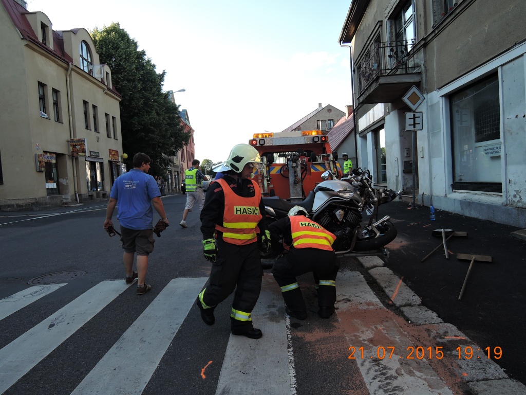 Druhá z nehod byla hasičům nahlášená v 16:26 hodin a boural při ní v Sedmihorkách u Turnova motocyklista a osobní automobil. Hasiči pomáhali s ošetřením zraněného motocyklisty a usměrňovali provoz na vytížené komunikaci I/35, doprava byla řízena kyvadlově. I zde hasiči uklidili komunikaci a zasypali sorbentem provozní kapaliny. Na místě zasahovaly 2 jednotky, profesionální hasiči z Turnova a jejich turnovští dobrovolní kolegové.