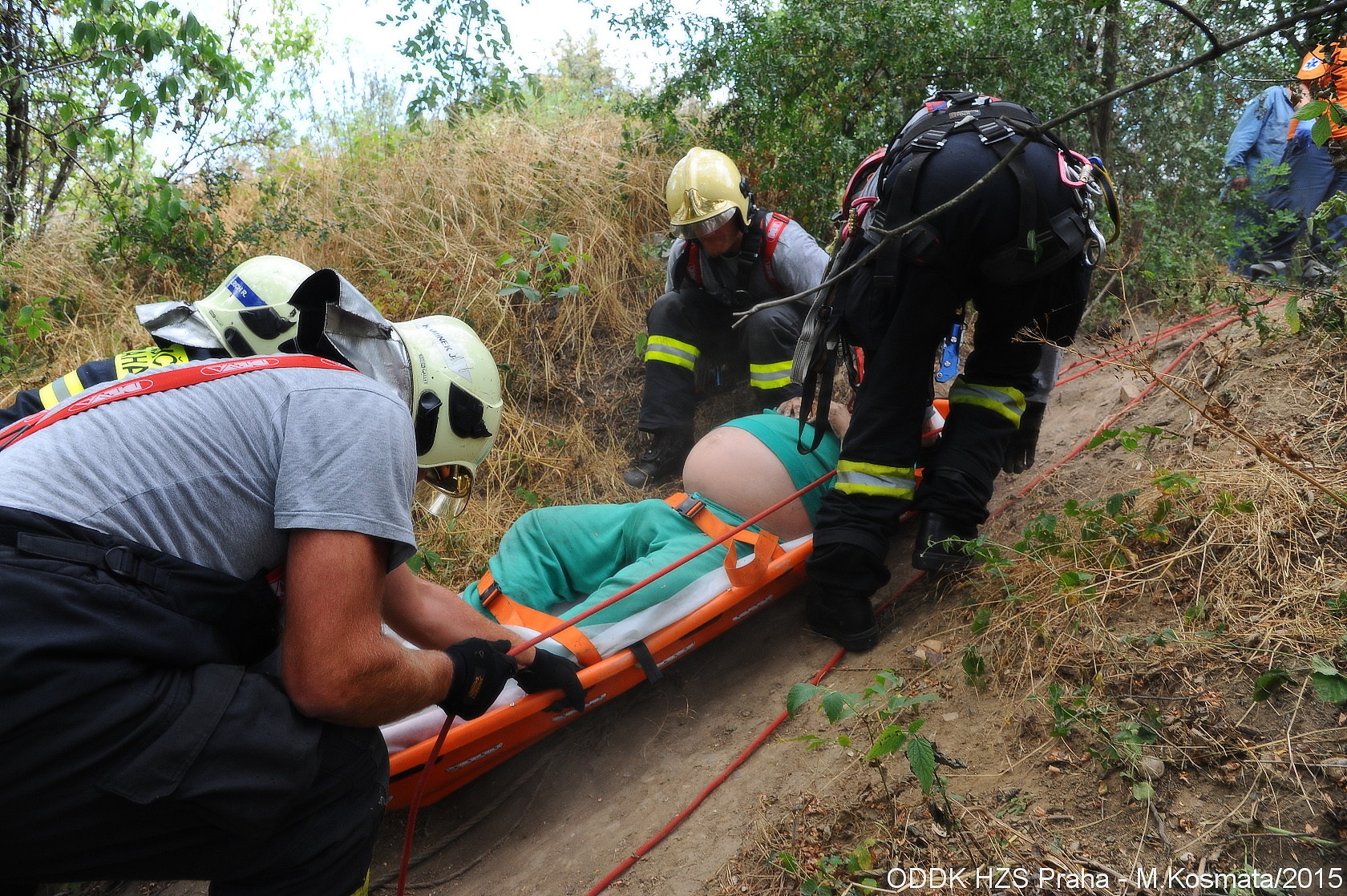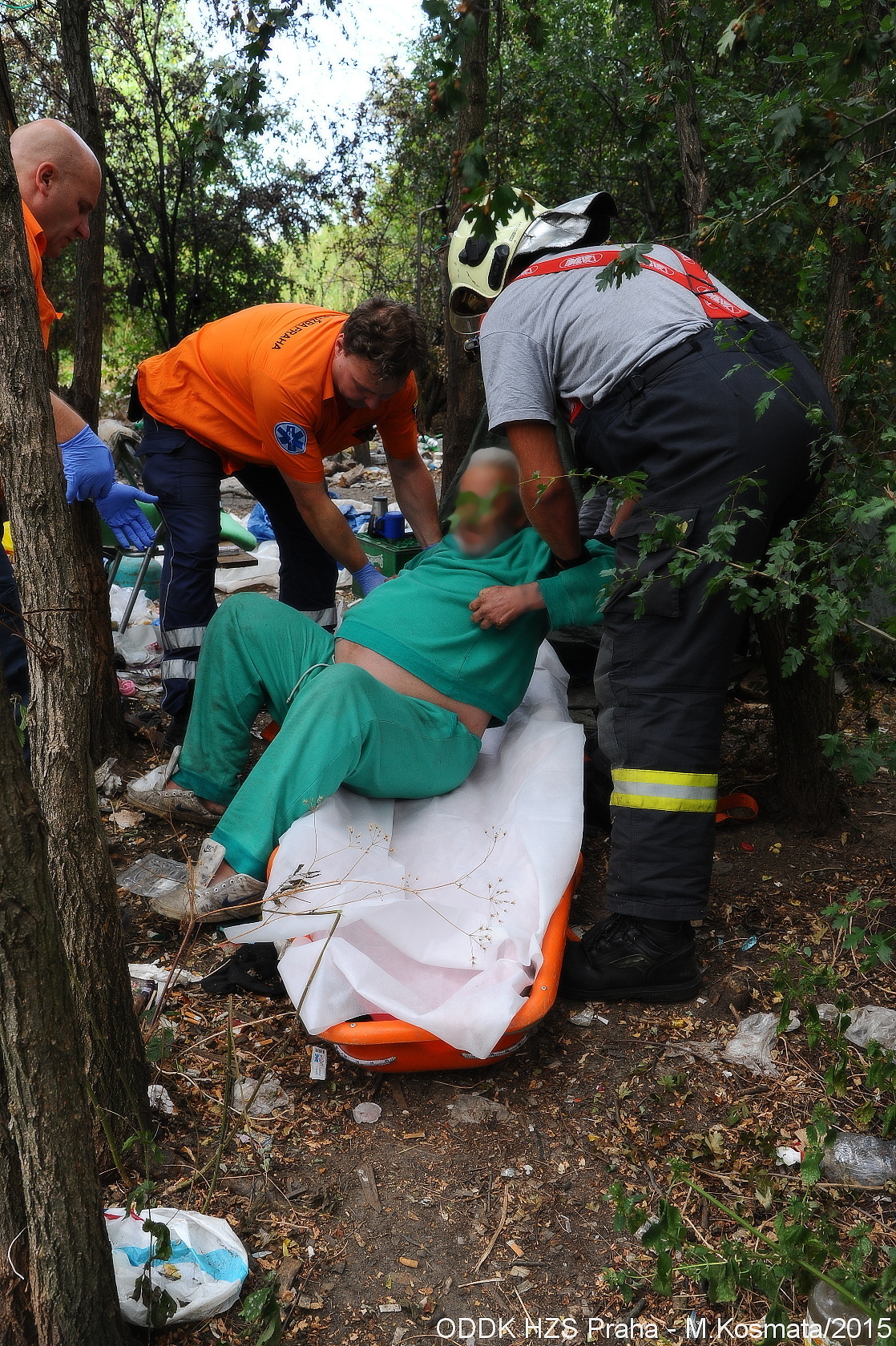 Nemohoucí bezdomovec se nacházel ve svém útočišti na svahu v Praze 9, ulici Chlumecká. Hasiči na místě provedli ve spolupráci se ZZS jeho naložení na vanová nosítka a pomocí lanové techniky ho dopravili dolů, odkud byl přenesen do sanitky.