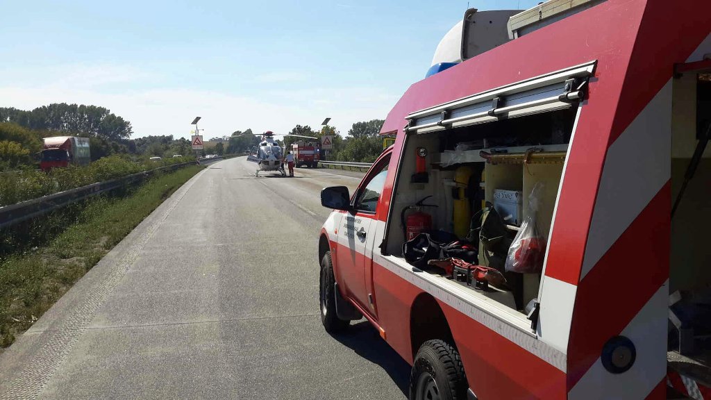 Dodávka s přívěsem čelně narazila v pravém jízdním pruhu do zadní části nákladního vozidla. Hasiči z požárních stanic Vyškov, Slavkov a Pozořice zahájili okamžitě po příjezdu vyprošťování osob z trosek havarovaného vozidla. Čtyřem osobám poskytli hasiči předlékařskou pomoc a zajistili místo nehody proti vzniku požáru. Jednoho ze zraněných transportoval k dalšímu ošetření vrtulník