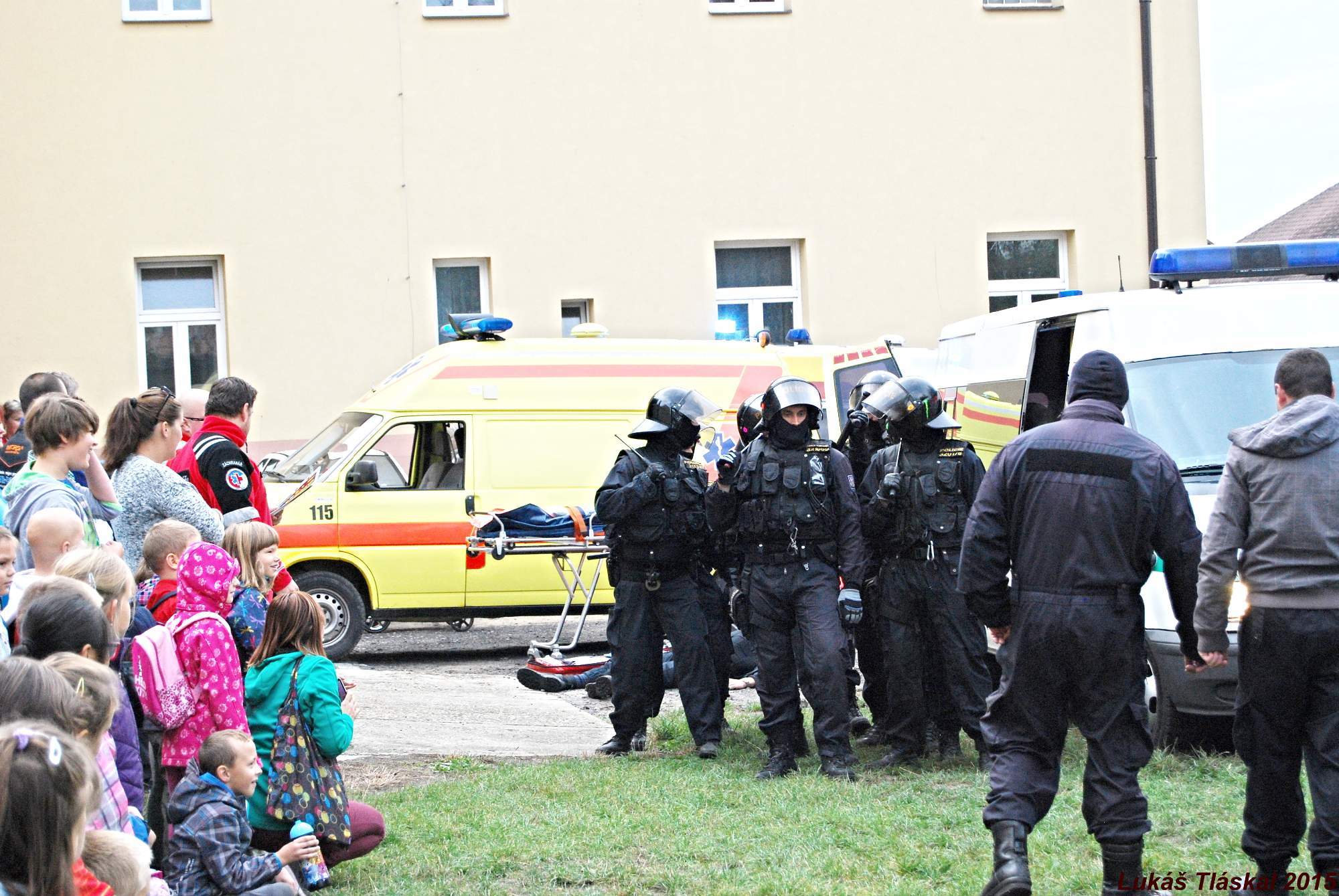 Za hasičský záchranný sbor se prezentovali lezci, určení pro záchranu osob z výšek a hloubek. Svoji činnost předvedli na vystavené plošině a při ukázkách jejich absolutní imunity vůči strachu z výšek se dětem tajil dech. Slaňování z výšky třiceti metrů hlavou dolů jistě zanechalo dojem a děti se mohli seznámit s další náročnou činností, kterou musí hasiči bezchybně ovládat.