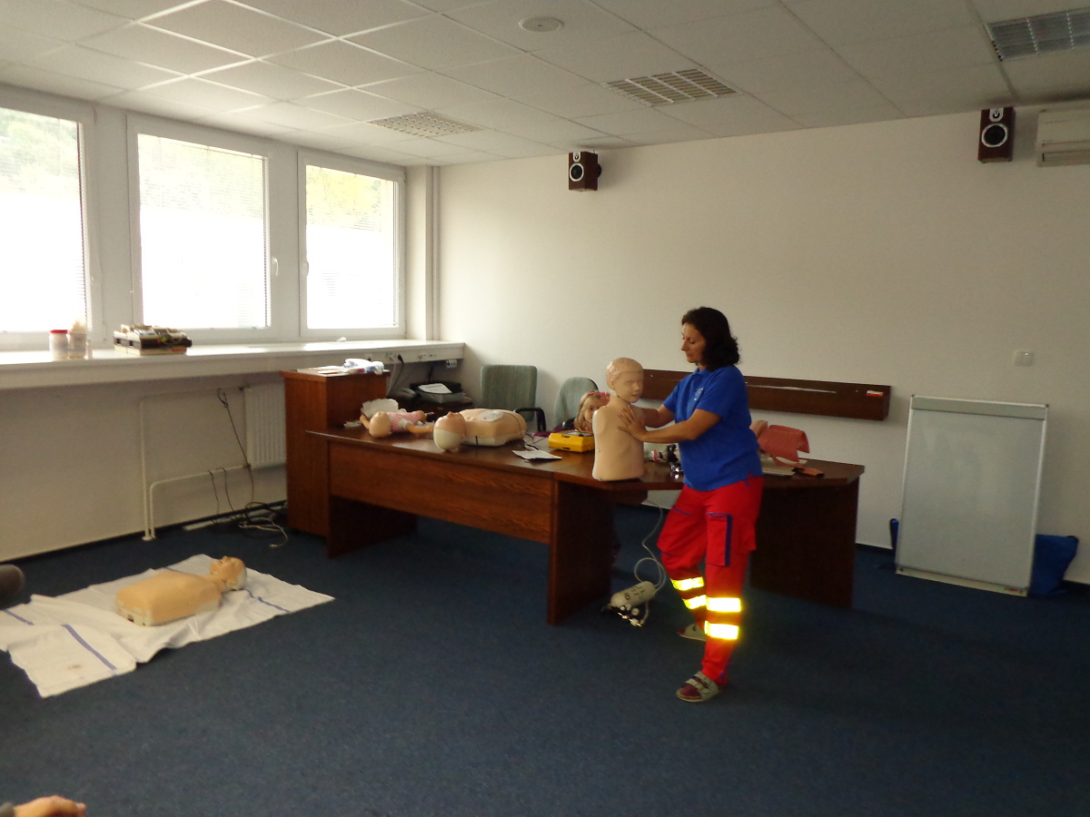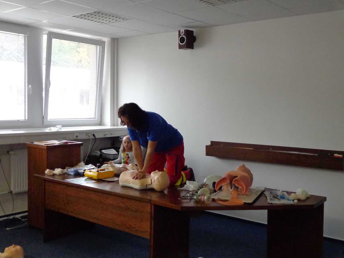 Velký zájem projevili návštěvníci o výuku první pomoci, která probíhala ve výukové a školící místnosti pod vedením Mgr. Dany Poláškové. Přítomní účastníci si vyzkoušeli nácvik život zachraňujících úkonů (zprůchodnění dýchacích cest, srdeční masáž, atd.) na resuscitačních modelech, a dozvěděli se další novinky v laické první pomoci.