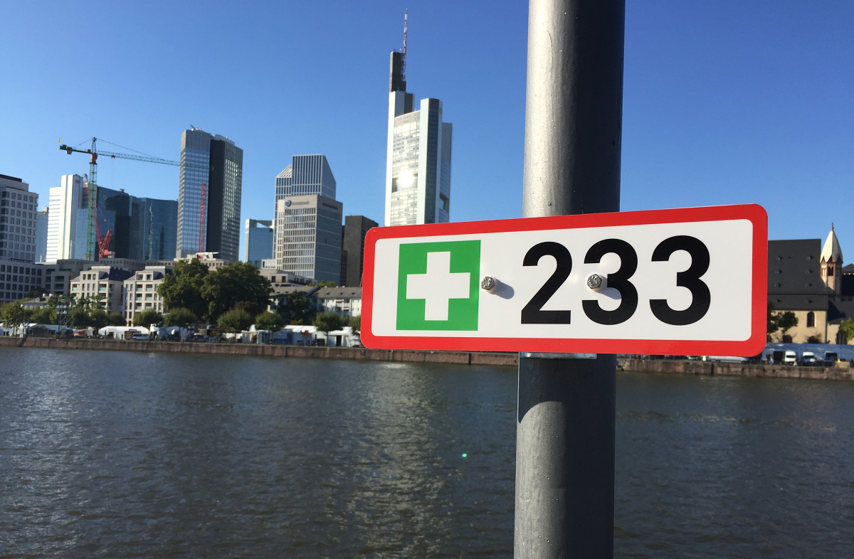 Proto se Hasičský sbor města Frankfurt rozhodl, že se tento stav musí změnit a nechal instalovat na sloupy lamp pouličního osvětlení cedule, tzv. záchranné body, které dle svého číselného označení označují konkrétní místo. Jakmile toto třímístné číslo sdělí volající operátorovi záchranných složek, ten si ho po zadání do počítače najde ihned na mapě, resp. mu na ní samo vyjede a on tak může poslat pomoc, aniž by bloudila a hledala.