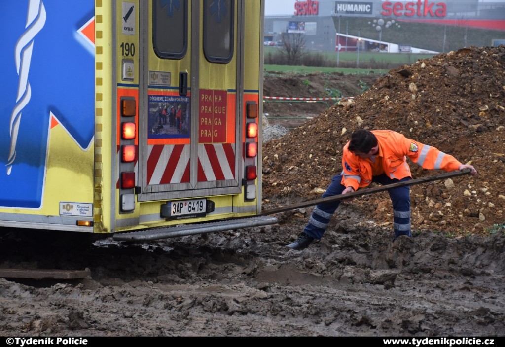 Sanitka pražské záchranky zapadla v bahně, když mířila do Ruzyně za zraněným dělníkem