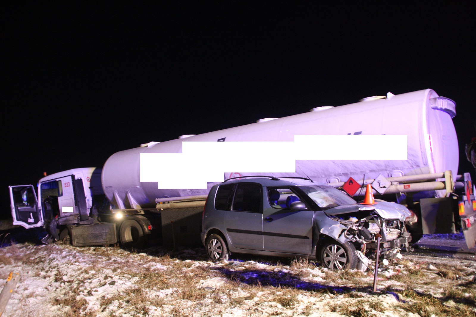 Hasiči po příjezdu uviděli, že na místě nehody stojí mimo komunikaci osobní vozy Ford Ka a Škoda Roomster, a tahač MAN s cisternou. V cisterně bylo převáženo dohromady 34 000 litrů benzínu a nafty. Cisterna nebyla nehodou poškozena.