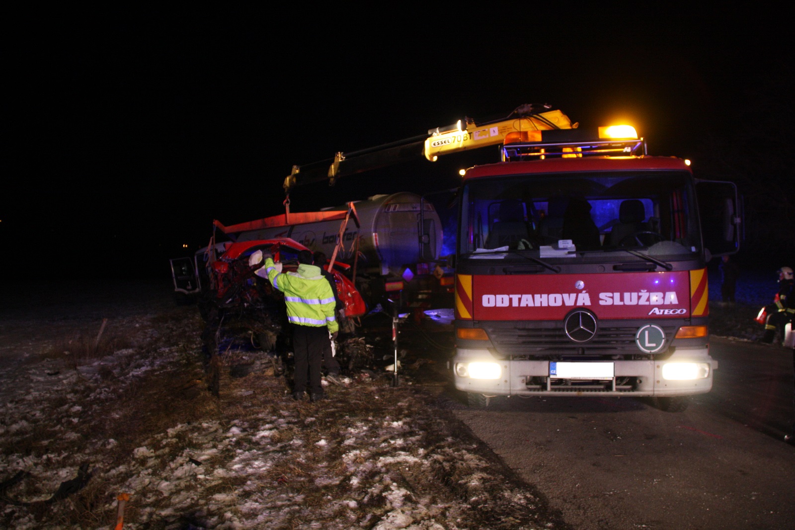 Hasiči v průběhu šetření příčin nehody osvětlovali místo havárie. Po ukončení šetření Policií České republiky uklidili vozovku.