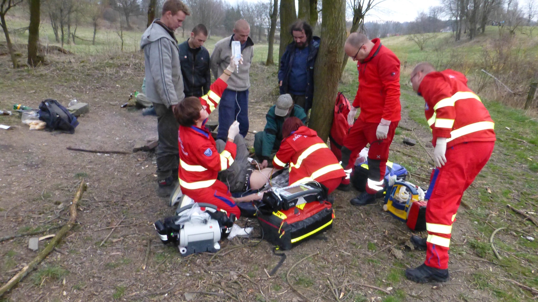 Před devatenáctou hodinou letěl vrtulník ke svému čtvrtému zásahu. Pětatřicetiletý muž v Budišově nad Budišovkou vylezl na strom, kde pod ním praskla větev, a postižený spadl na zem z výšky několika metrů. Způsobil si poranění páteře, zasahující lékaři vyslovili rovněž podezření na poranění mozku. Posádka LZS pacienta ošetřila ve spolupráci s pozemní posádkou RLP Vítkov a poté jej transportovala do FN v Ostravě.