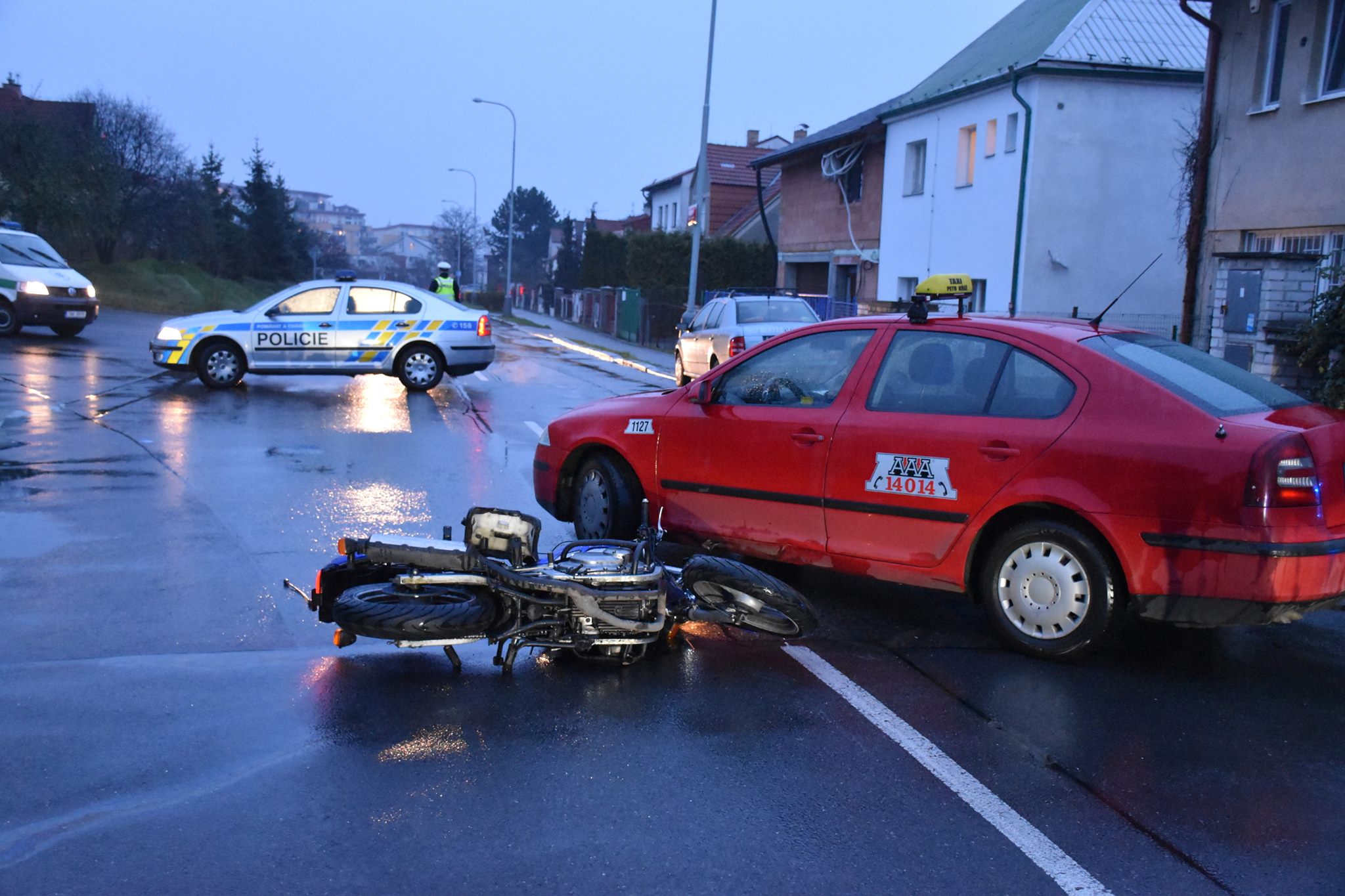Motorkář po střetu s taxíkem v pražských Stodůlkách utrpěl naštěstí jen lehké zranění