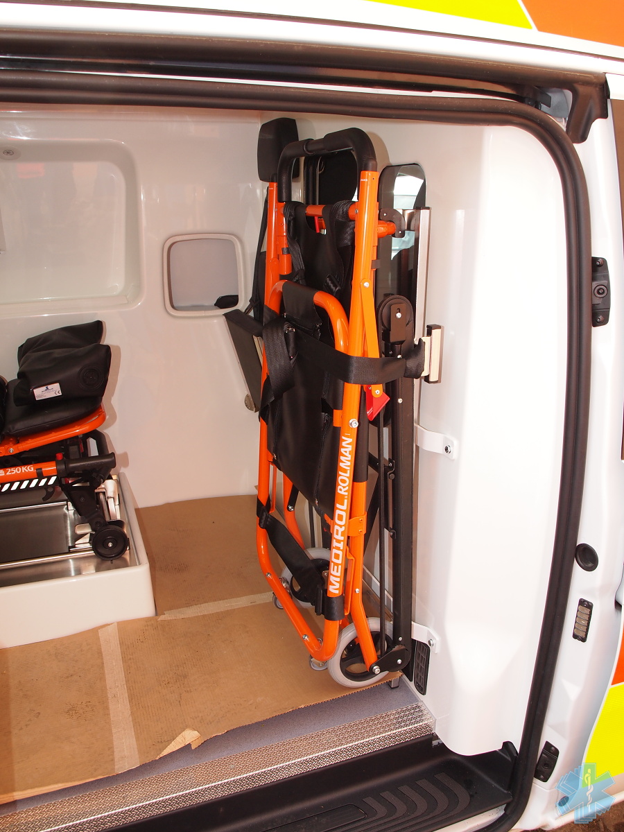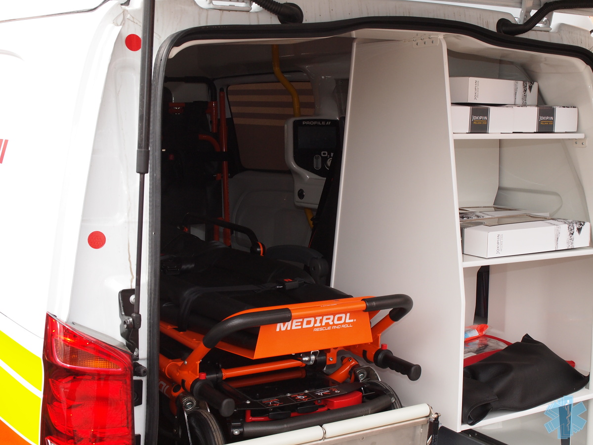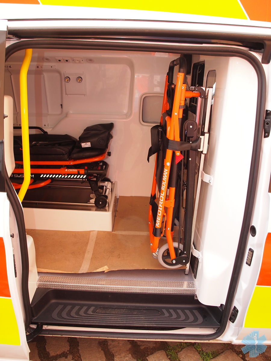 Přístup do vozu je zajištěn přes bočí posuvné dveře, či přes zadní nahoru výklopné dveře. V zadní části je prostor pro uložení zdravotnických batohů a dalších pomůcek. Ty mají své místo dále uvnitř vozu v krytých úložných prostorech. Co si kdo do vozu umístí, je čistě na provozovateli a daných předpisech.