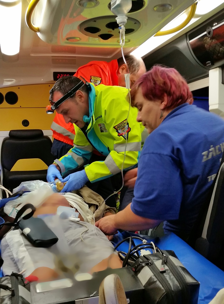 Pacient byl s vážným poraněním hlavy napojen na umělou plicní ventilaci a za pomoci hasičů přenesen do sanitního vozu, který ho přepravil k vrtulníku. Ten muže transportoval na oddělení ARO motolské nemocnice. Zdali šlo o sebevražedný čin nebo nešťastnou náhodu, šetří policisté.