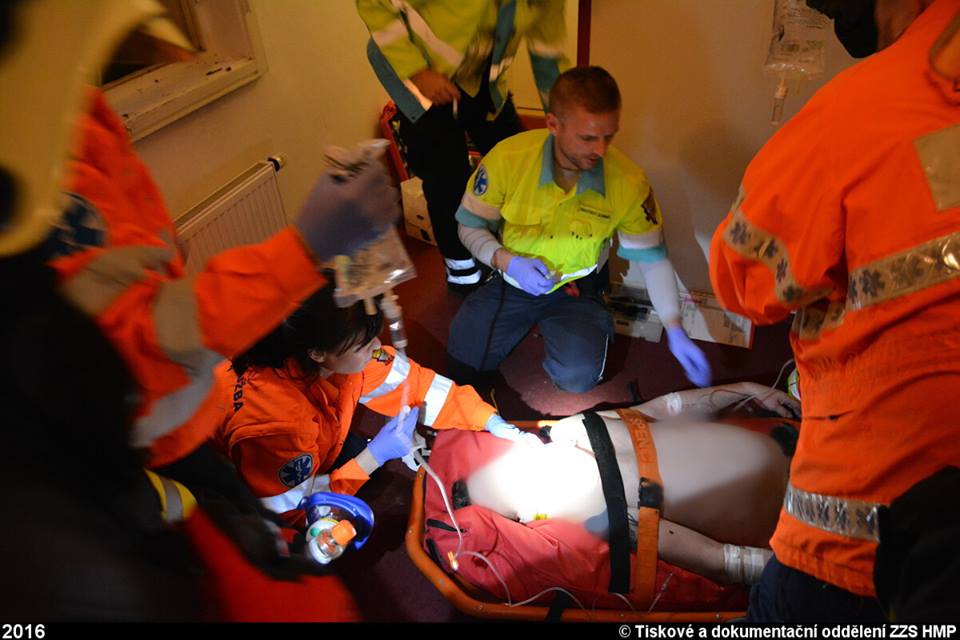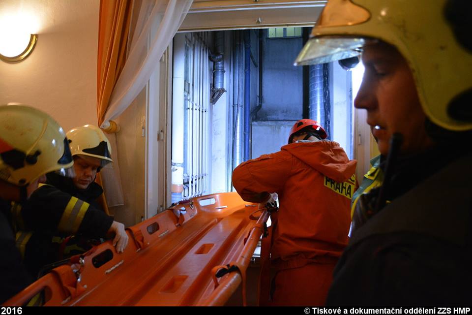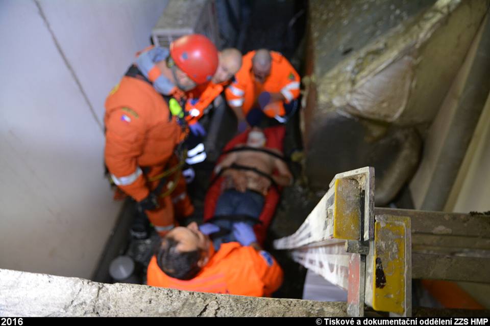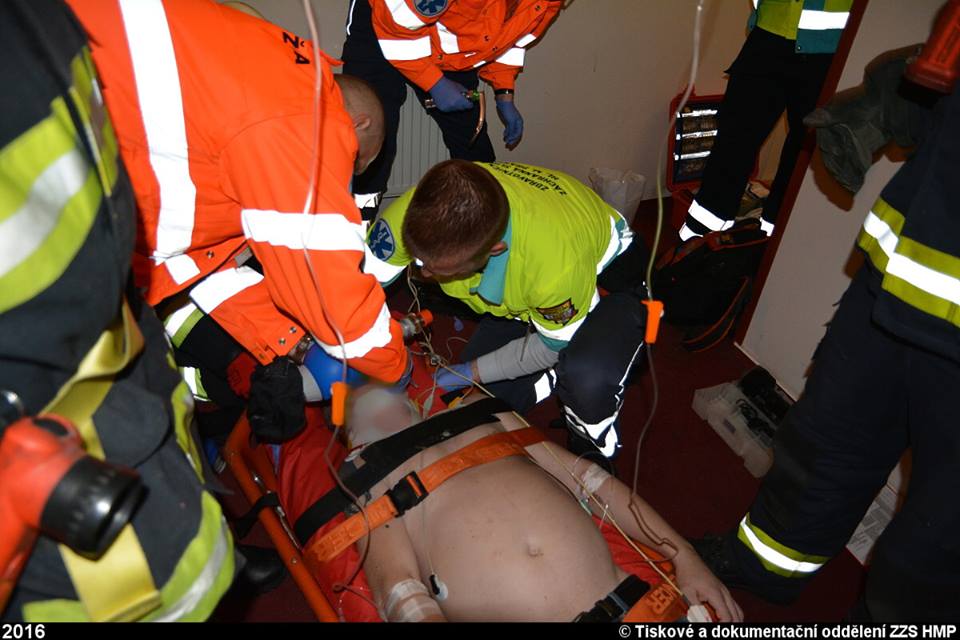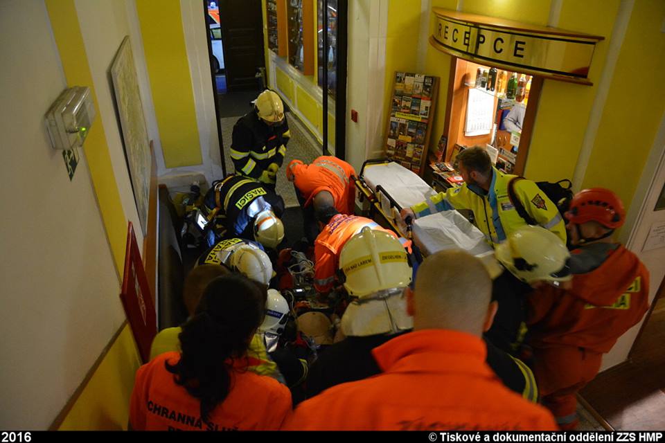 Po příjezdu našich posádek bylo zjištěno, že se jedná o pád muže z úrovně zřejmě třetího patra na dno hotelového světlíku, který utrpěl vícečetná závažná zranění a nacházel se v obtížně přístupném místě. Záchranáři k němu museli slézt s potřebným vybavením po vypůjčeném žebříku a po vyšetření započali ošetřování včetně zajištění žilních vstupů zraněného, imobilizovaného ve vakuové matraci. S transportem nám museli pomoct hasičští lezci.