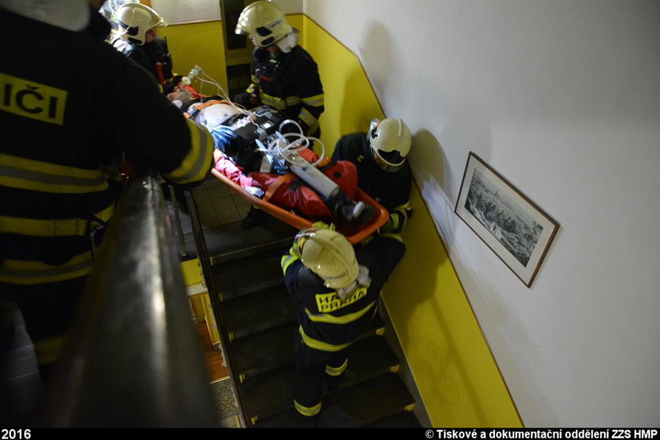Muž byl vytažen do chodby ve vanových nosítkách, lékařka zahájila poté další nezbytné úkony, vedoucí k zajištění vitálních funkcí a přípravě k transportu do zdravotnického zařízení. Muž byl zaléčen a po zajištění dýchacích cest odnesen z patra na nosítka, následně přeložen do sanitky. Jakmile to bylo možné, vyrazila kolona záchranářských vozidel směrem do střešovické ÚVN, kde byl předán k další odborné péči tamním lékařům.