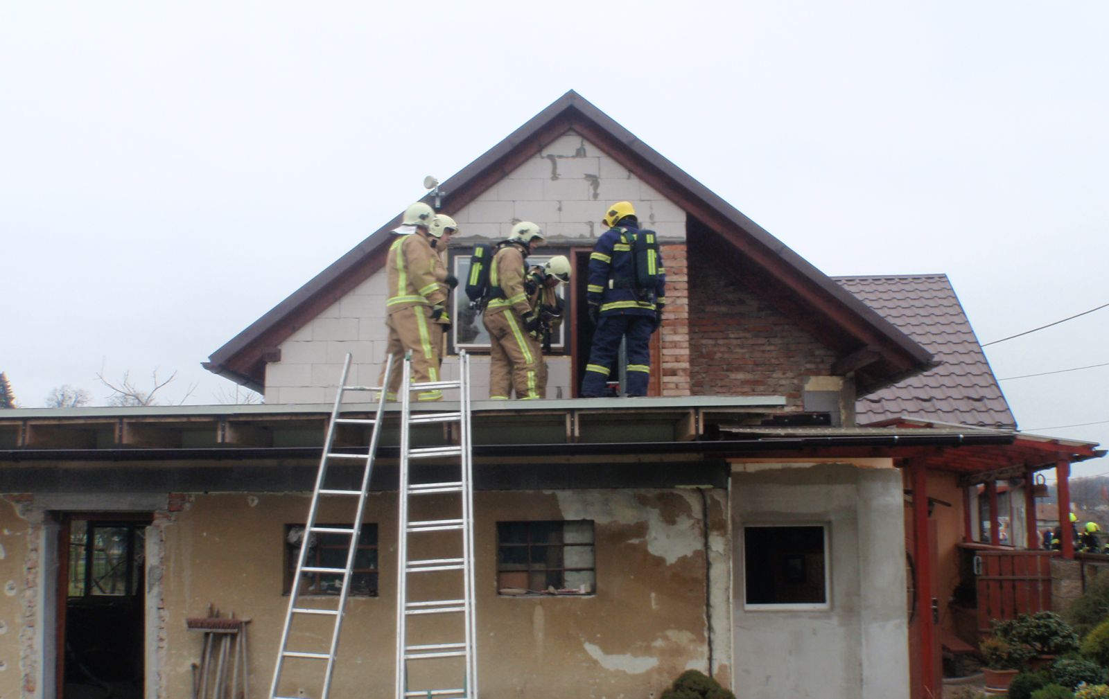 Hasiči vybavení dýchací technikou vnikli do domu a požárem zasažené místnosti. Celý interiér objektu byl silně zakouřen. Na podlaze obytné místnosti pak hasiči našli ležícího muže. Pomocí nosítek ho vynesli z objektu a okamžitě mu začali poskytovat předlékařskou pomoc. Následně si popáleného muže převzala do své péče posádka zdravotnické záchranné služby. Pro jeho další transport do nemocnice byl na místo povolán vrtulník letecké záchranné služby.