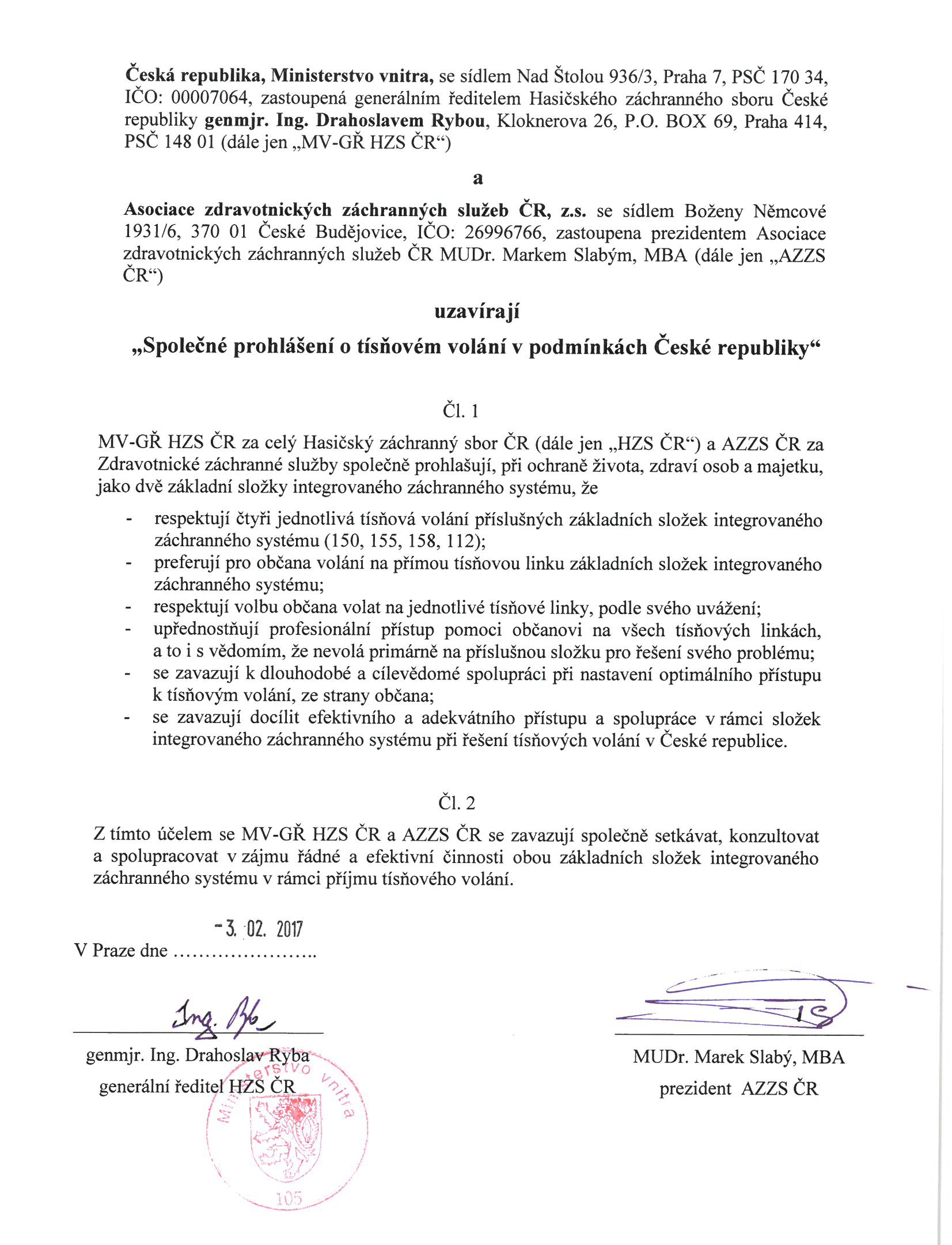 MV-generální ředitelství HZS ČR za celý Hasičský záchranný sbor ČR a AZZS ČR za Zdravotnické záchranné služby v tomto prohlášení společně prohlašují, že při ochraně života, zdraví osob a majetku, jako dvě základní složky integrovaného záchranného systému, respektují čtyři jednotlivá tísňová volání příslušných základních složek integrovaného záchranného systému a preferují pro občana volání na přímou tísňovou linku základních složek integrovaného záchranného systému. Na druhou stranu zároveň respektují volbu občana volat na jednotlivé tísňové linky, podle svého uvážení a budou prosazovat profesionální přístup pomoci občanovi na všech tísňových linkách, a to i s vědomím, že nevolá primárně na příslušnou složku pro řešení svého problému.