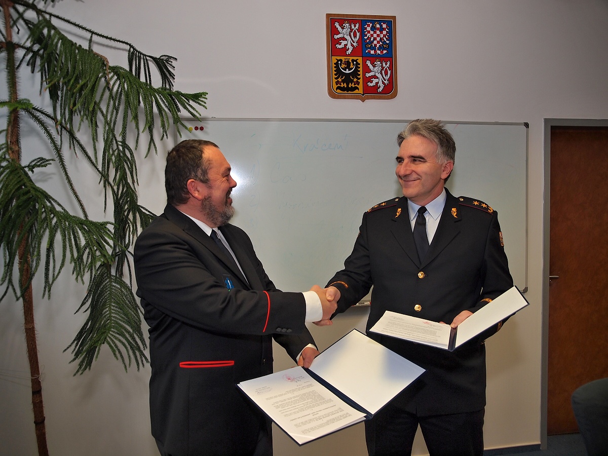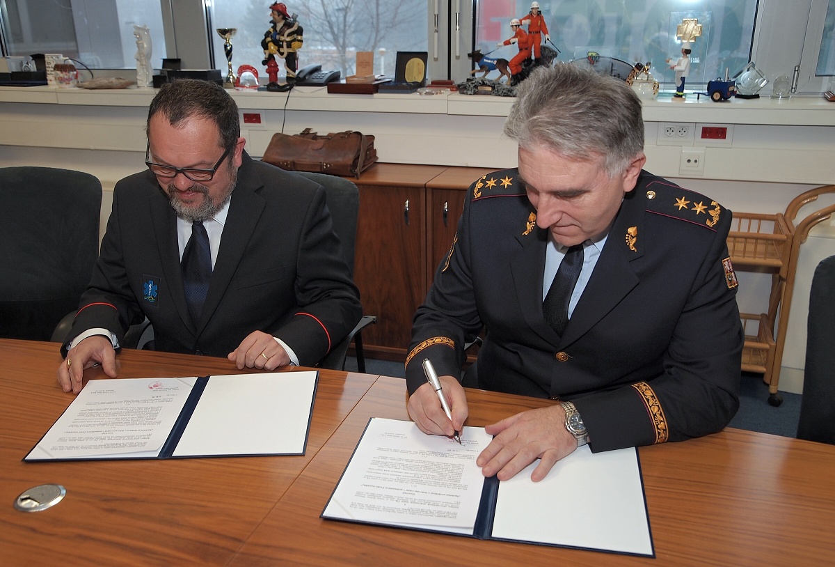 Generální ředitel HZS ČR genmjr. Drahoslav Ryba a MUDr. Marek Slabý, MBA, prezident asociace zdravotnických záchranných služeb ČR dnes společně podepsali prohlášení o tísňovém volání v podmínkách České republiky.