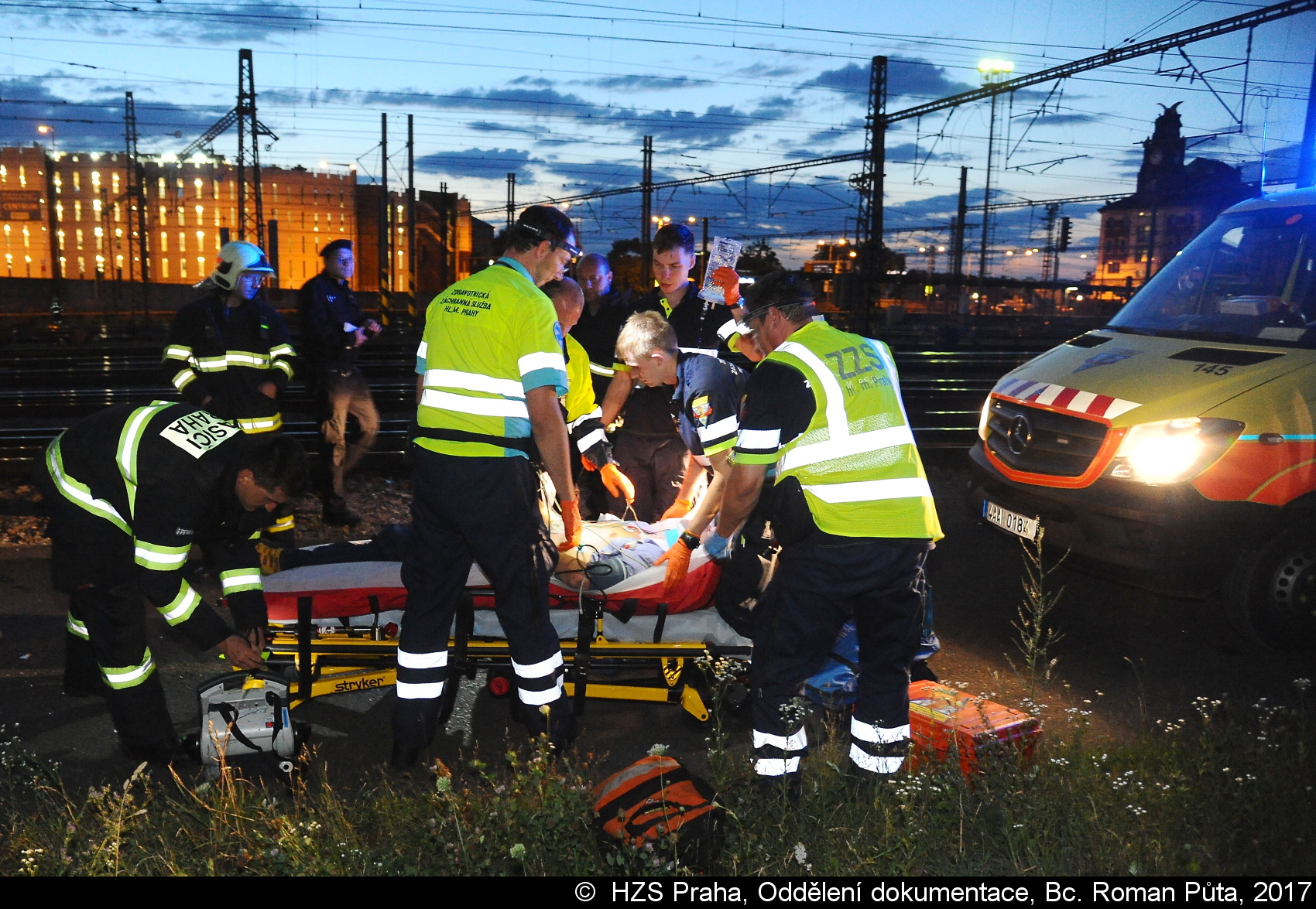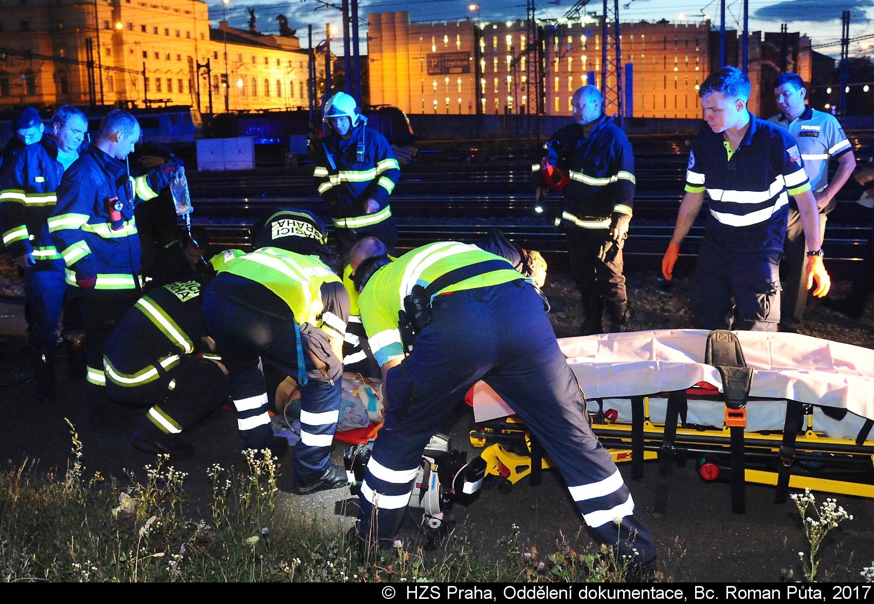 Záchranáři osobu – mladého muže, jenž utrpěl při střetu s vlakem zranění hlavy, po zajištění a ošetření transportovali k další péči do vinohradské nemocnice. U události zasahoval lékař, vozidlo RZP a inspektor (provozu).