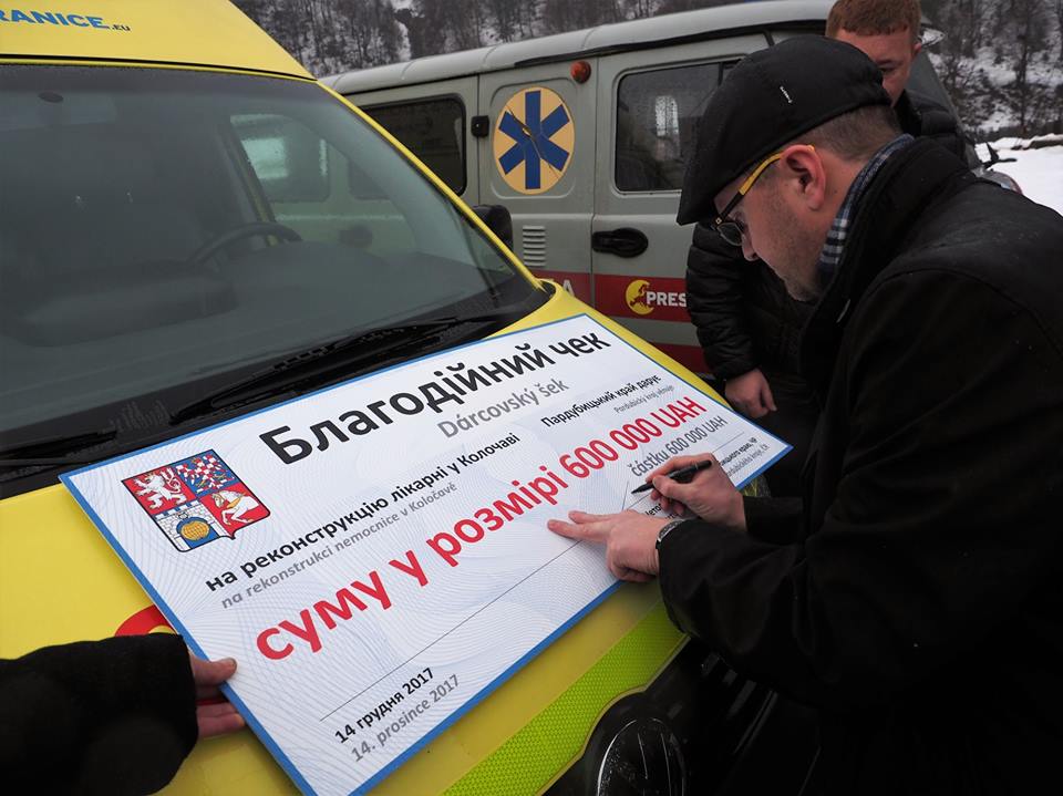 Obě vozidla odvedou pro občany ve velmi chudé oblasti Ukrajiny ještě hodně práce. Porovnejte rozdíl na fotografii – stará a nová sanitka v Koločavě (VW vs. UAZ). Zároveň jsme předali symbolický šek na rekonstrukci budovy místní nemocnice, kterou využívají i čeští turisté. Kvalitní zdravotní péče je velmi kvalitní, ale v imořádně skromných podmínkách, které odpovídají situaci v ČR před třiceti až čtyřiceti lety.