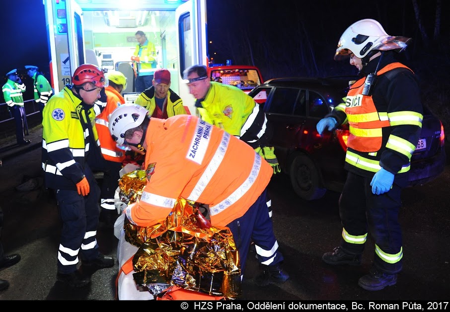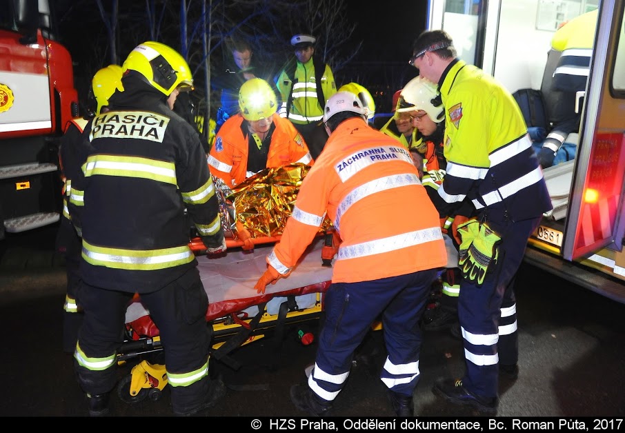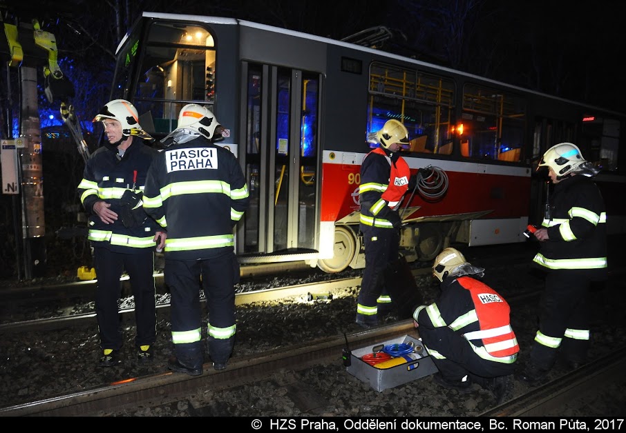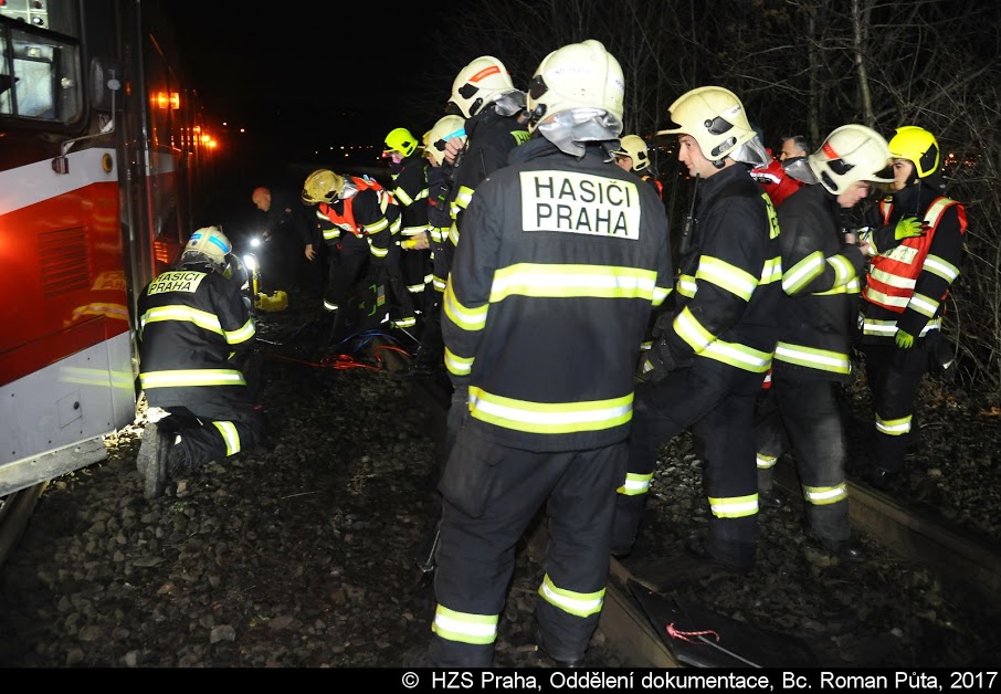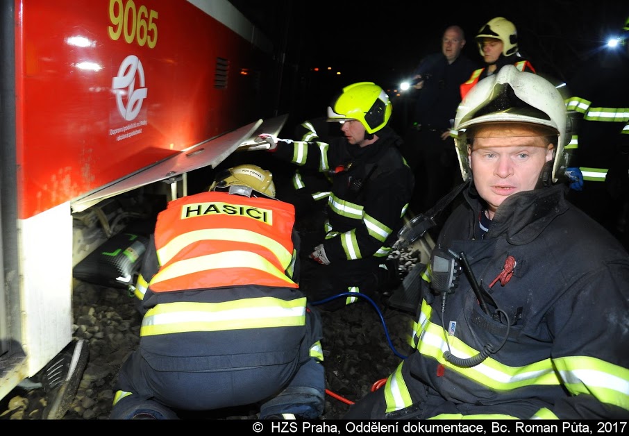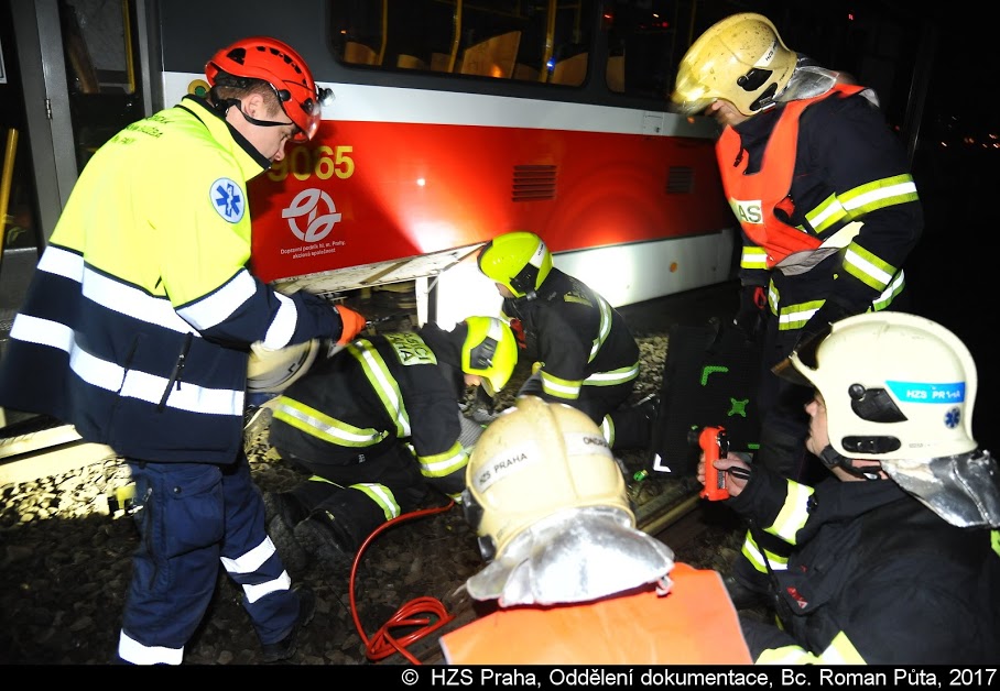 Pražští hasiči za 15 minut vyprostili zraněnou osobu, která zůstala po srážce s tramvají zaklíněna pod soupravou