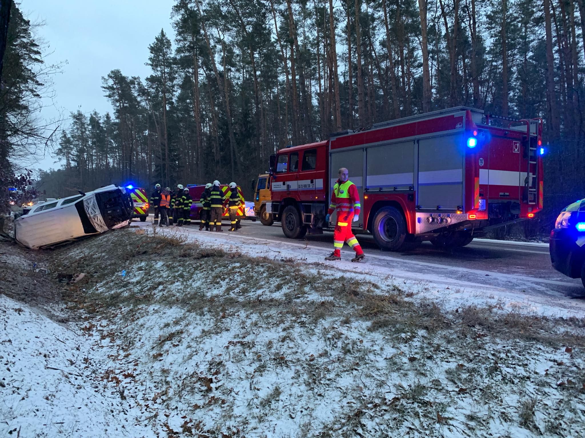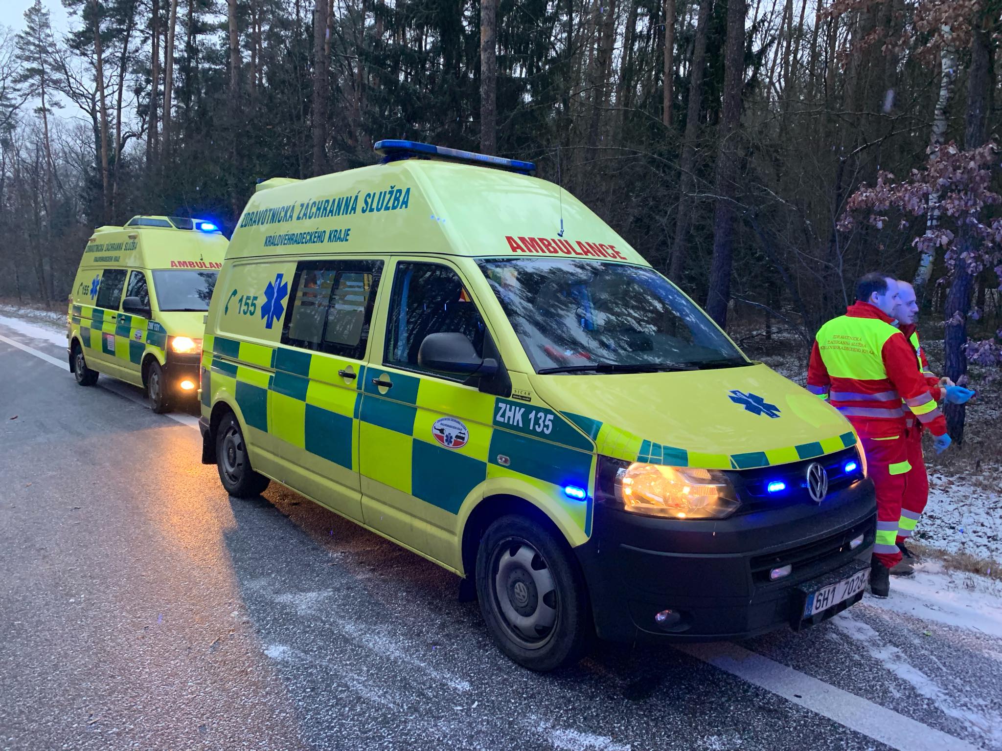 O necelou půlhodinu později už operátoři linky 155 přijímali oznámení o další nehodě nedaleko Třebechovic pod Orebem na Královéhradecku. Po smyku a nárazu do stromu tam skončila mimo vozovku dodávka. Přes hrozivě vyhlížející nehodu vyvázli dva muži, kteří v dodávce cestovali, pouze s lehkými zraněními. Zasahující záchranáři je tak po ošetření mohli ponechat na místě. Tolik štěstí už, bohužel, neměl pes, kterého ve voze převáželi. Ten při nárazu utrpěl zranění, která nepřežil.