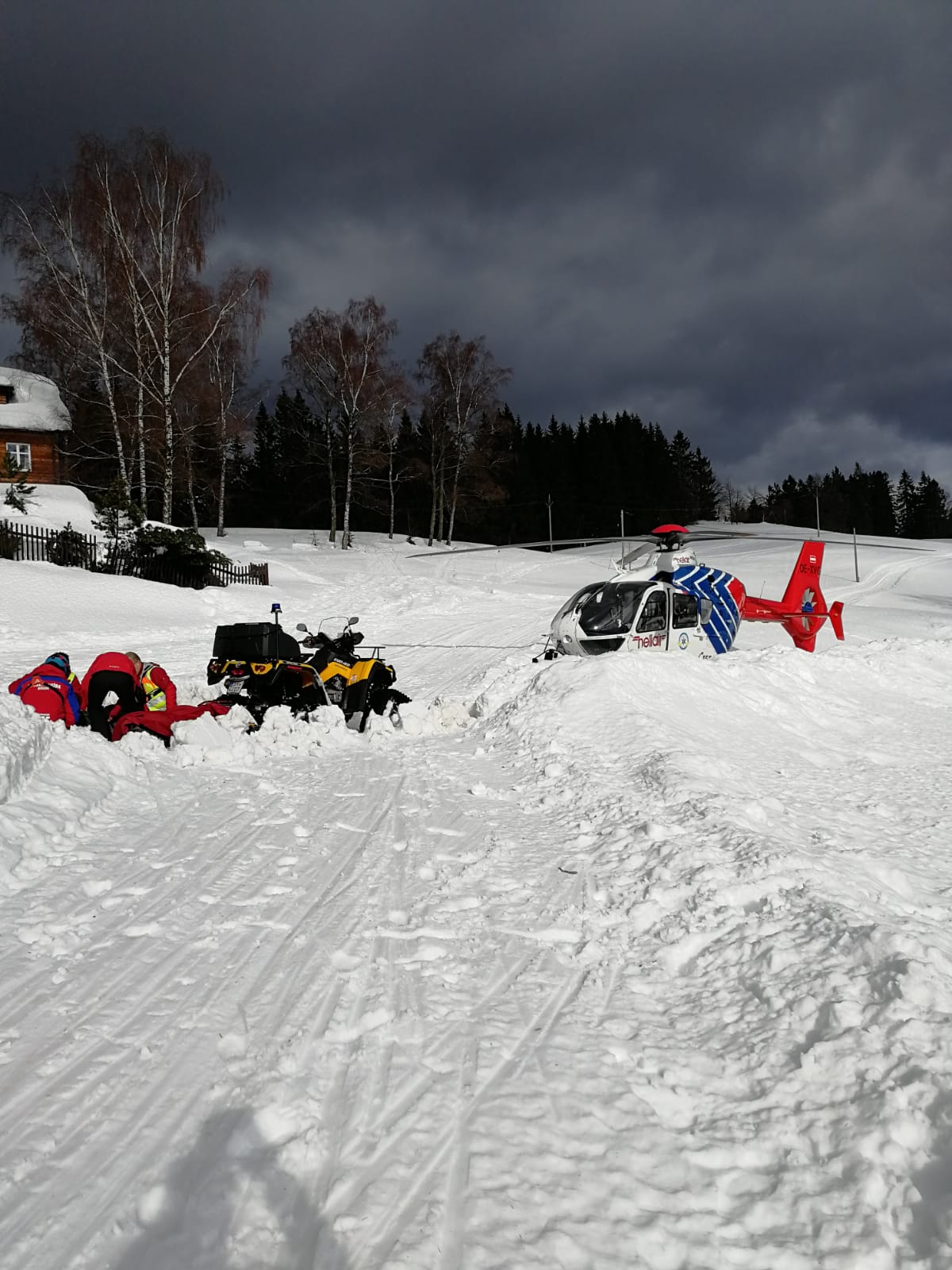 Šedesátiletou pacientku po pádu na běžkách ošetřila nejprve horská služba a následně letečtí záchranáři. Zasahující lékař zjistil vážné poranění dolní končetiny. Ženě byly podány léky tlumící bolest, potom ji tým LZS uložil do vakuové matrace, zajistil tepelný komfort a provedl další opatření v rámci přednemocniční neodkladné péče. Postižená byla následně šetrně letecky transportována na urgentní příjem ostravské Fakultní nemocnice.