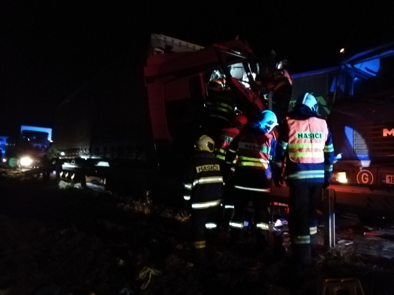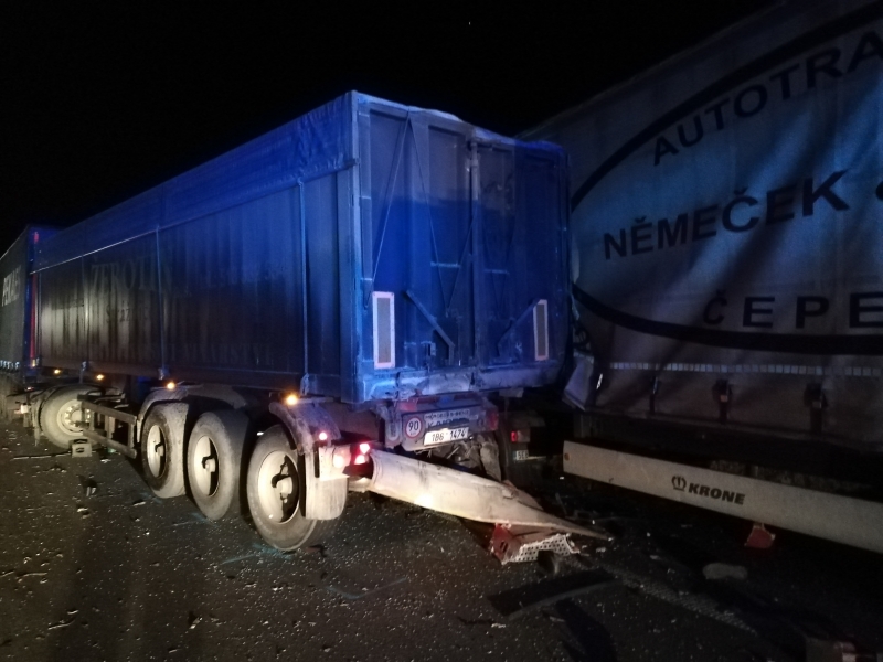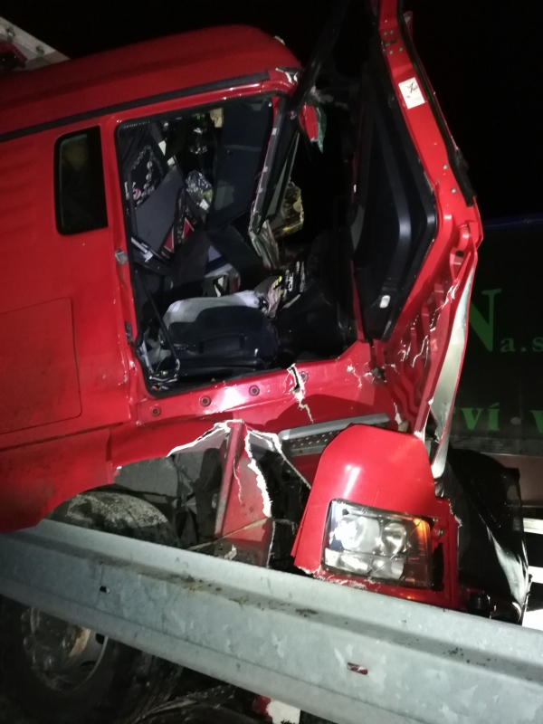 Na dálnici u Rakvic se srazily dva kamiony, jeden z řidičů utrpěl těžká zranění, vyprošťován z vraku vozu byl téměř hodinu