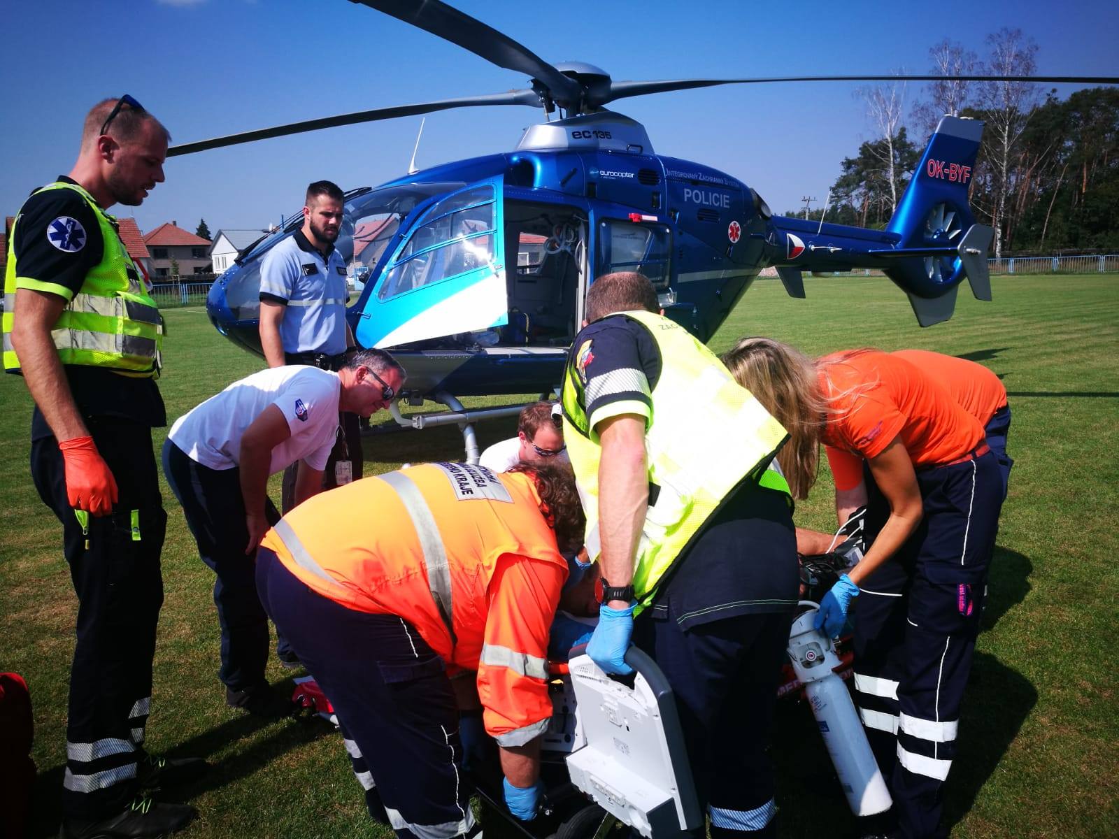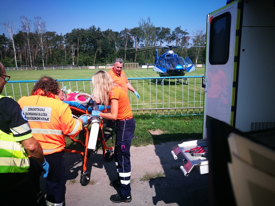 Záchranáři zajistili žilní vstup a začali muže léky tlumit, neboť pro transport LZS musí být pacient v klidu. Zraněný muž musel být nakonec uveden do umělého spánku a připojen k umělé plicní ventilaci. Až poté mohl být s podezřením na krvácení do mozku přepraven vrtulníkem do střešovické nemocnice.