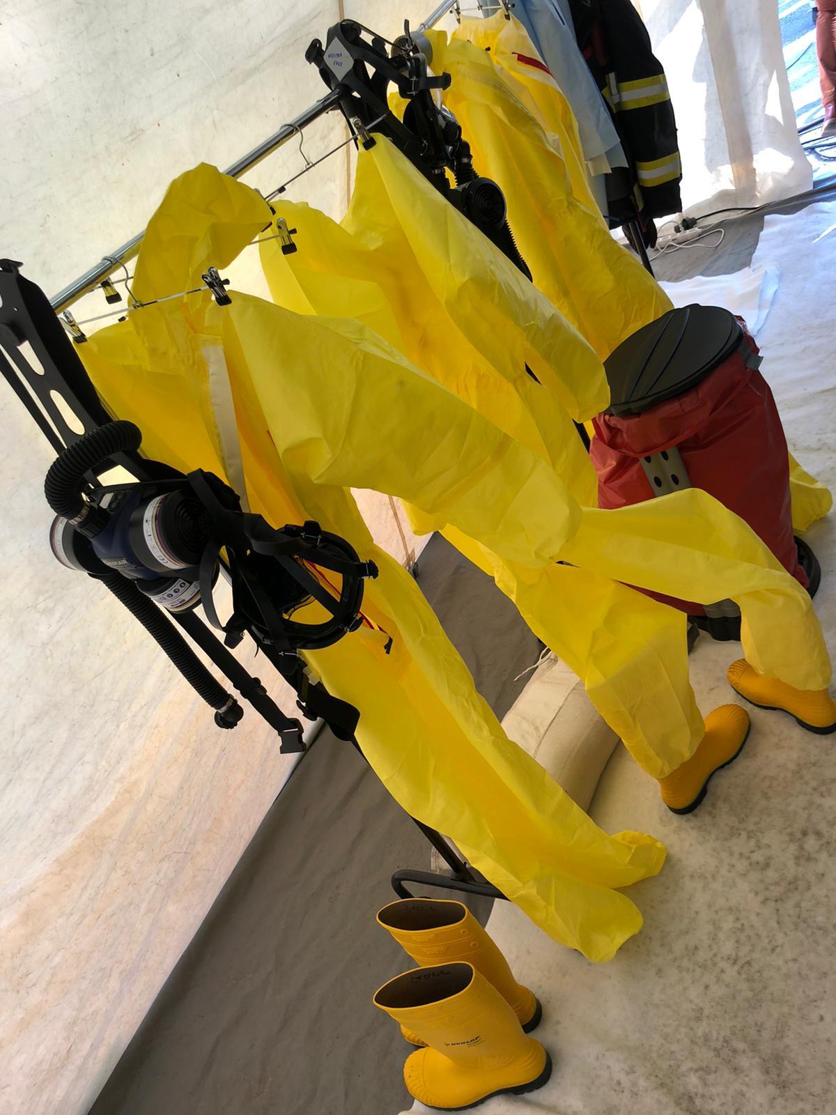 Dvoučlennou posádku můžete potkat v těchto „skafandrech“, což jsou celotělové protichemické obleky doplněné o gumovou holínkovou obuv. Bezpečné a komfortní dýchání záchranářům zajišťuje celoobličejová maska a filtroventilační jednotka. Veškeré ochranné pomůcky jsou omyvatelné a po dekontaminaci je lze znovu použít.