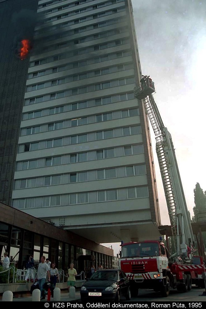 S ohledem na charakter objektu vyjel i velitel směny a výjezd odboru zjišťování příčin požárů. Mezitím se hlídka v 11. patře pokouší o prvotní zásah ručními hasicími přístroji na rozpálené dveře místnosti pokojské, po jejich otevření se valí dým a šlehají plameny.