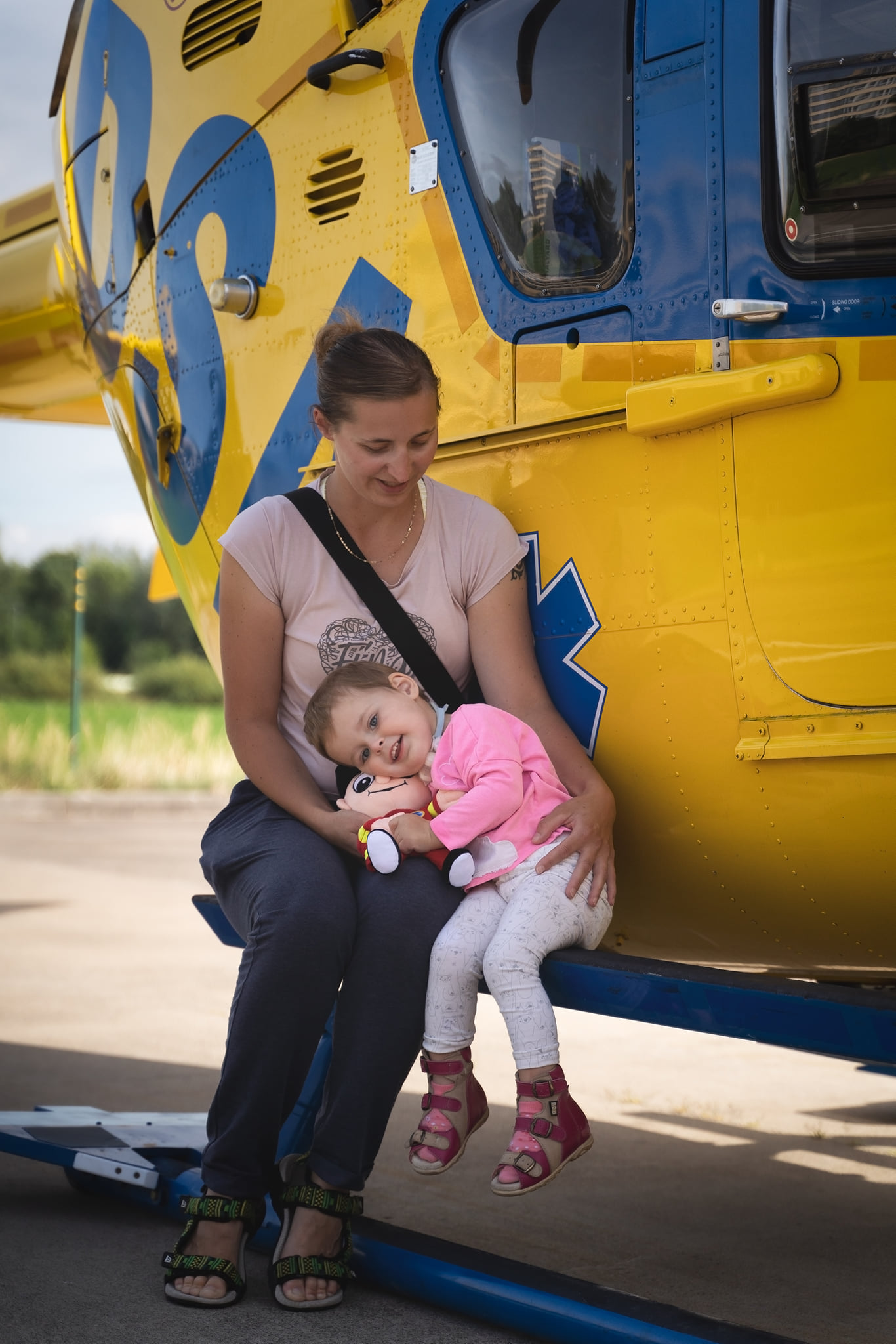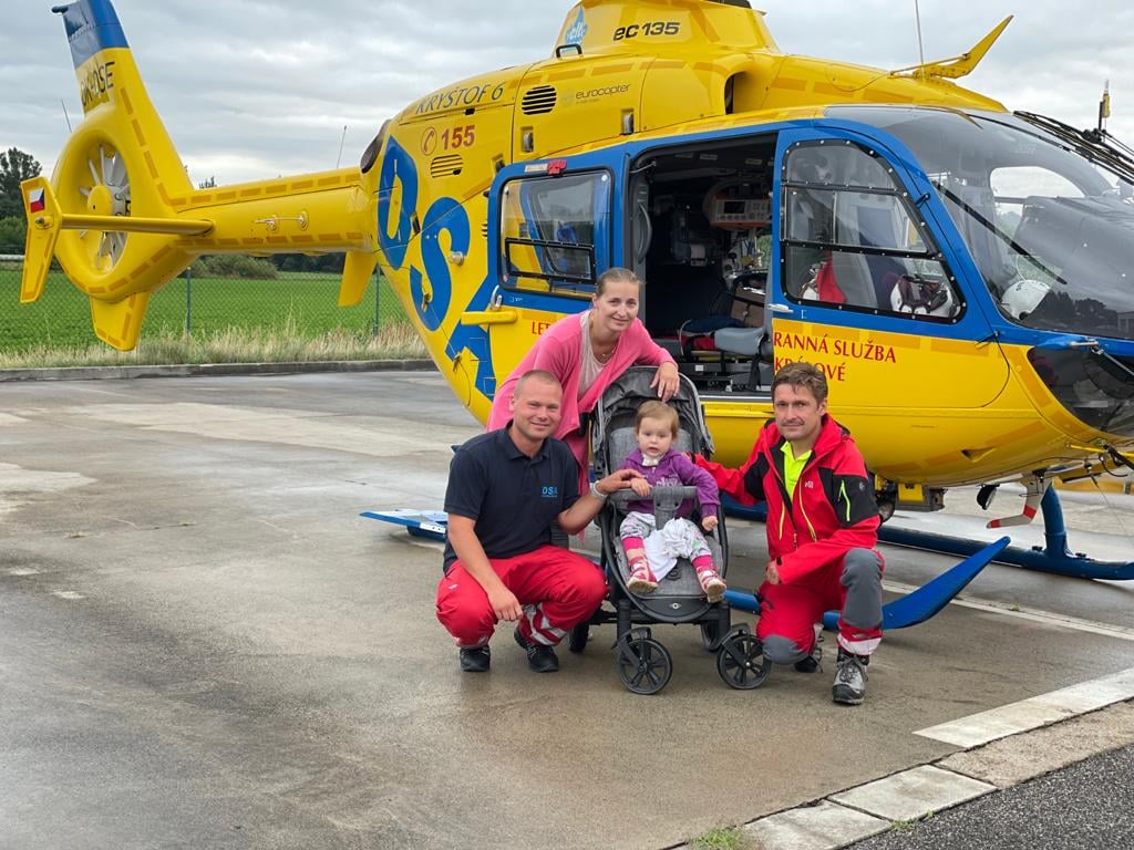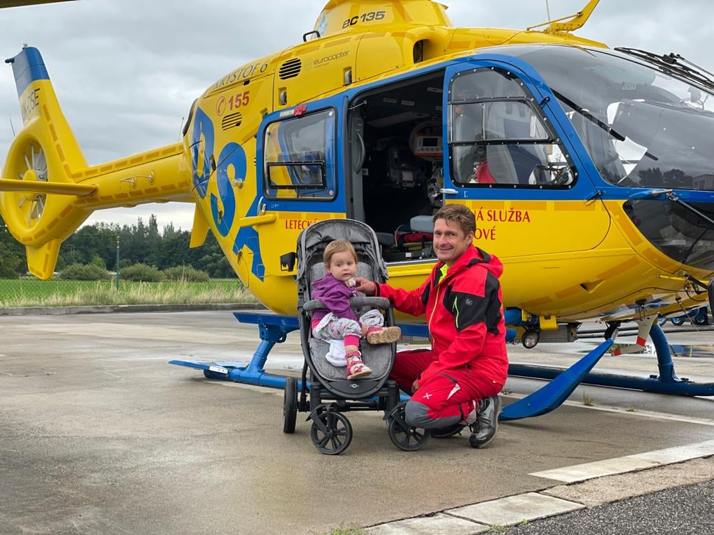 Podruhé jsme s Aničkou přišli do styku, když ji naši záchranáři Václav Trojan a Jan Berger převáželi spolu s maminkou na specializované pracoviště do Ostravy, kde se podrobila léčbě pomocí hyperbarické oxygenoterapie v přetlakové komoře. Anička sice dýchala sama, ale důvod k oslavám to rozhodně nebyl. O to radostnější překvapení nás čekalo zkraje srpna, když se i s maminkou náhle objevily na základně LZS. Do třetice všeho dobrého. Anička se měla čile k světu, zvědavě pobíhala kolem a sloužícího záchranáře dokonce poplácávala plácačkou na mouchy 🙂