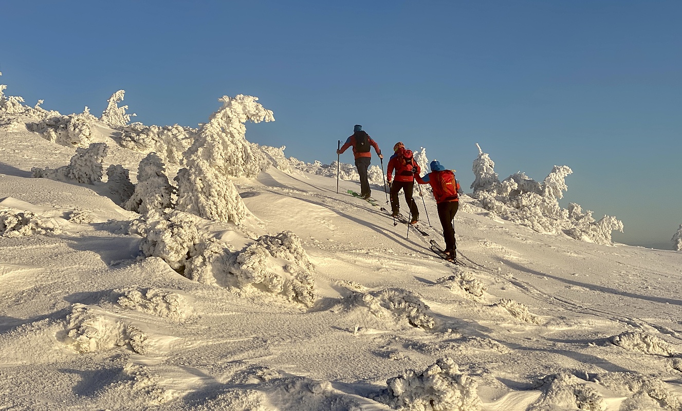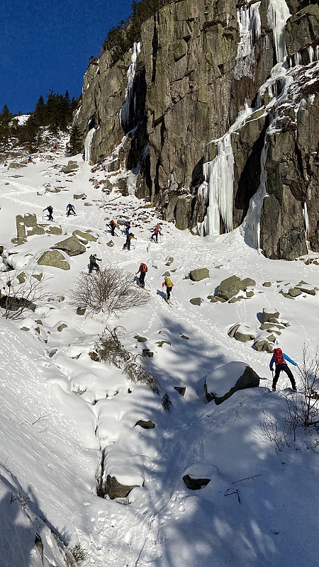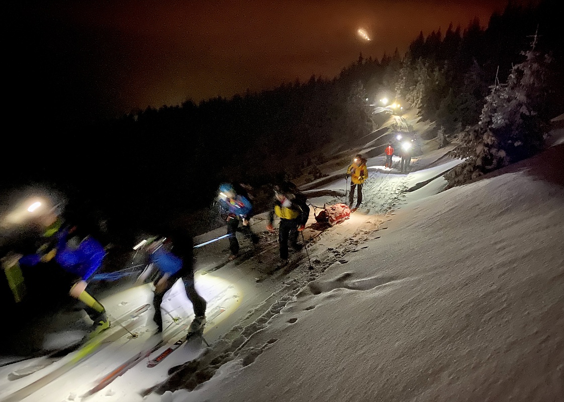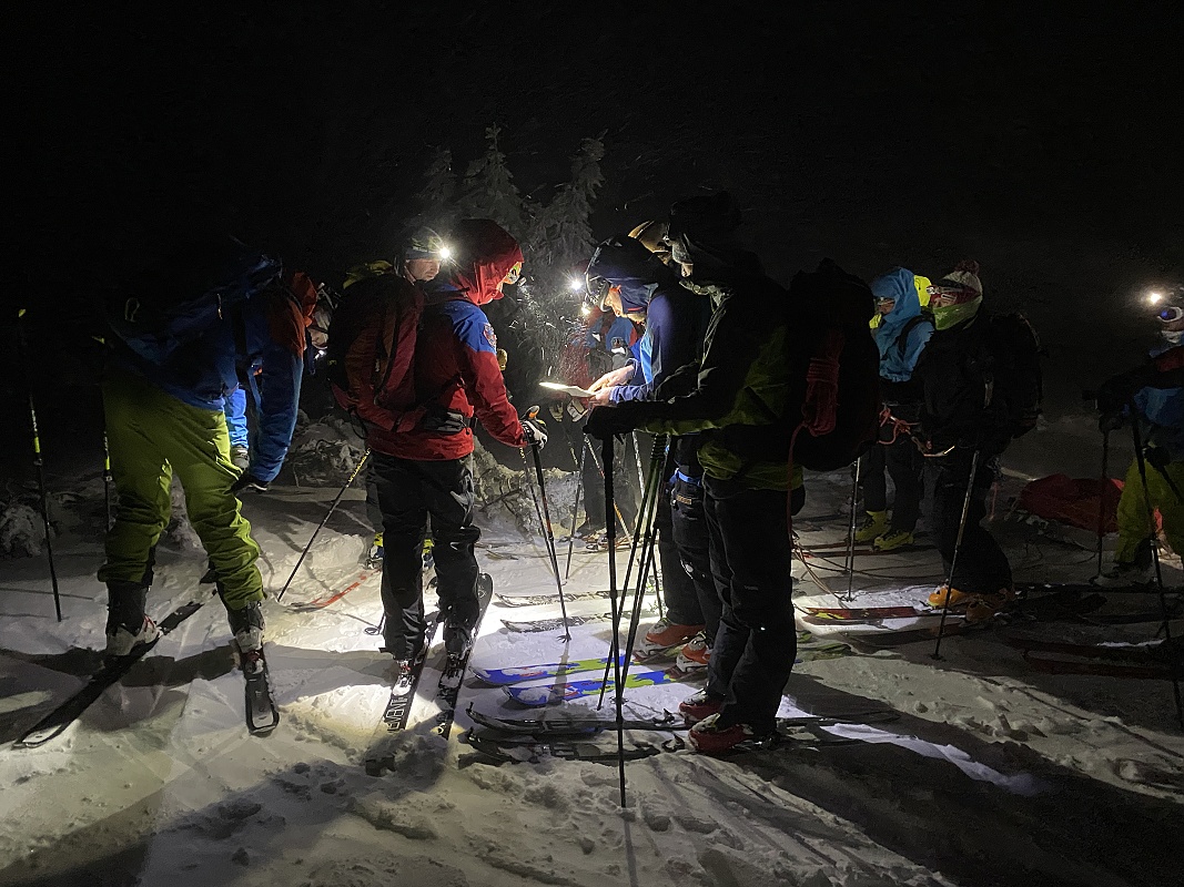 Zimní část je pak zaměřena na ošetřování a transport pacientů ze sjezdových tratí, lavinovou problematiku, pohyb v exponovaném terénu v zimních podmínkách, lezení na ledopádech, záchranu osob pomocí lanových technik, meteorologii atp. Čekatelé také musí předvést své dovednosti na sjezdových lyžích a fyzickou zdatnost prověří skialpinistická etapa s časovým limitem. I přes ne úplně ideální sněhové podmínky, které v minulém týdnu na horách panovaly, se podařilo vše řádně odcvičit.