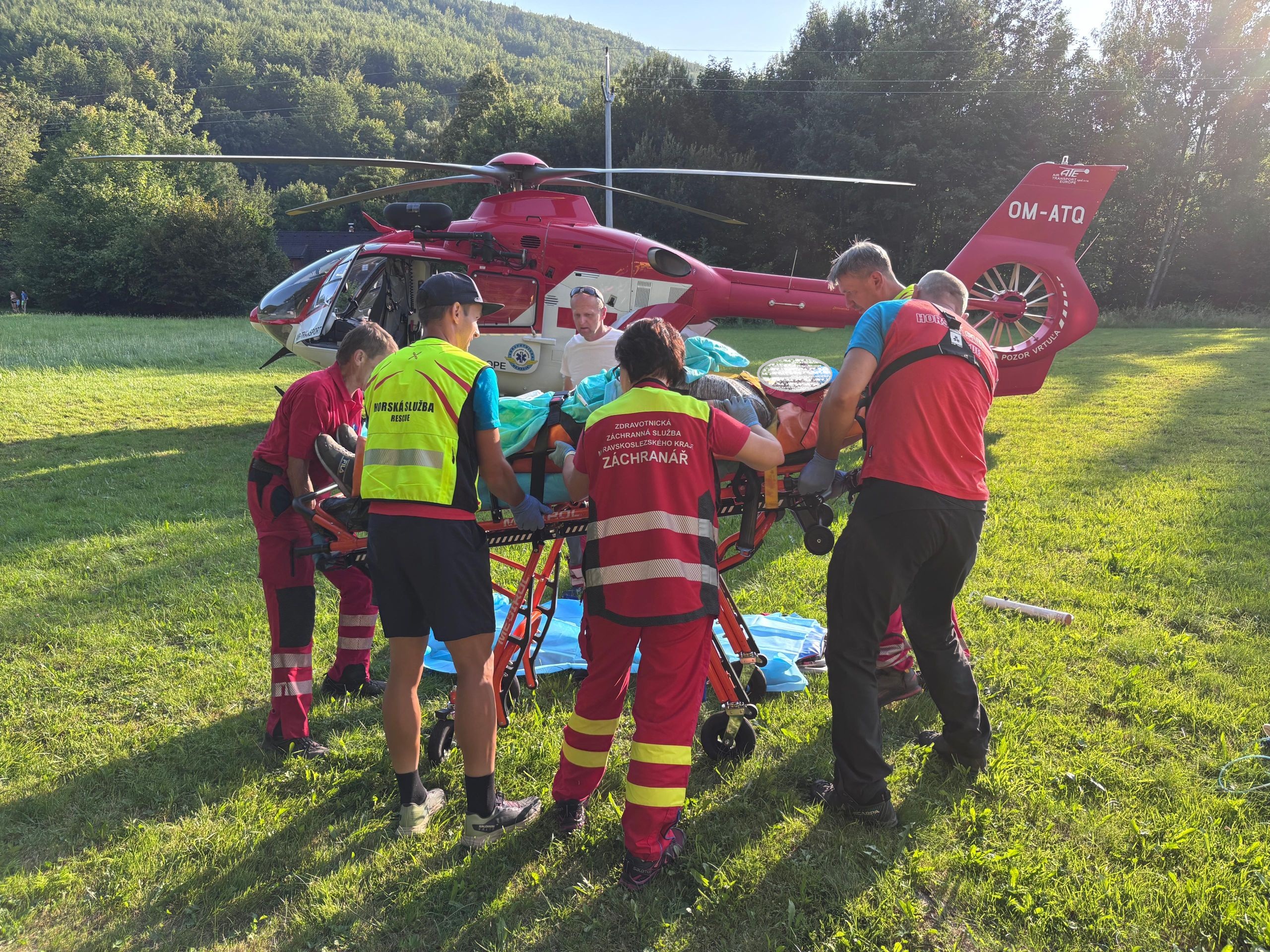 Devětadvacetiletý muž byl v době příjezdu posádky záchranné služby již při vědomí, měl však příznaky těžkého poranění hlavy, dále oděrky a tržné ranky v obličeji a na horních končetinách. V rámci přednemocniční neodkladné péče bylo provedeno znehybnění páteře, ošetření ran a zajištění periferní žilní linky pro podávání infuzí. Pozemní posádka poté pacienta přepravila k hotelu Ráztoka, kde byl přeložen na palubu vrtulníku.