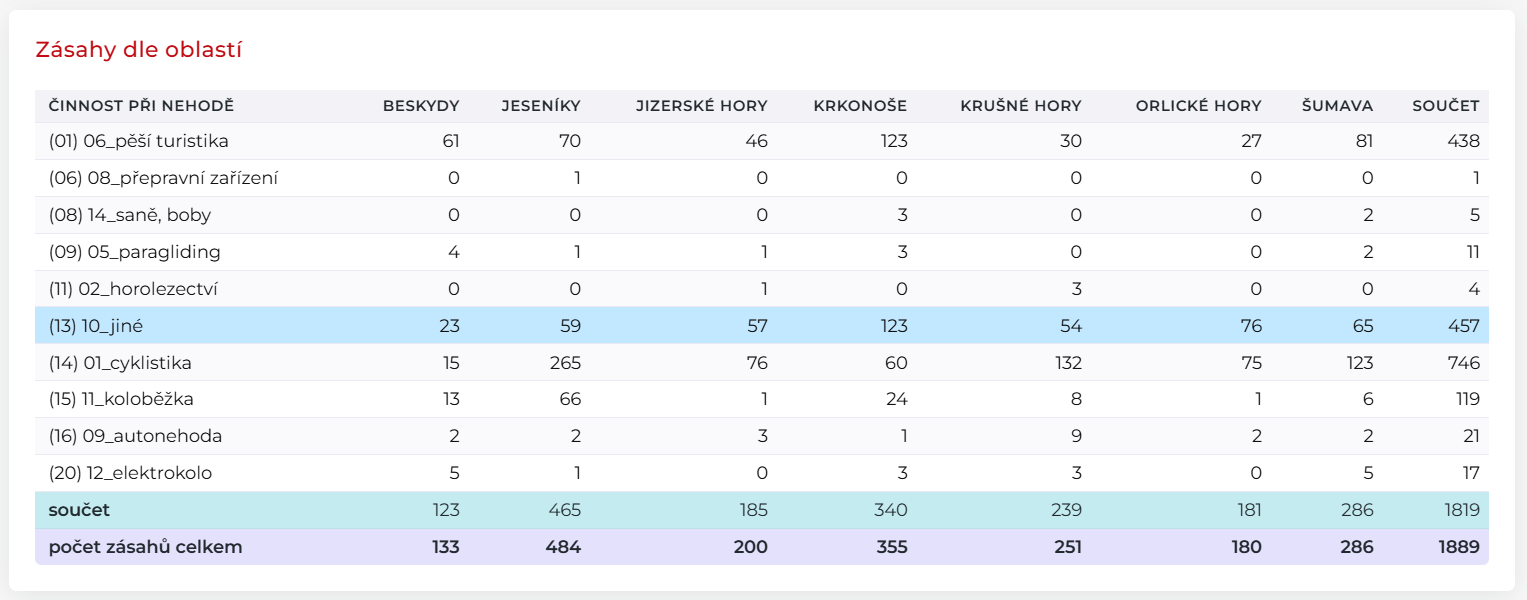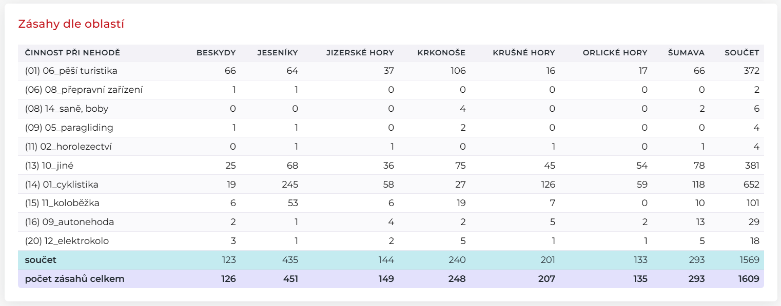 Škála zásahů byla, tak jak je u zásahů horských záchranářů standartní, velmi široká. Od řešení lehkých oděrek až po neodkladnou pomoc u závažných, život ohrožujících stavů. Největší počet zásahů měli v letošním létě, tak jak to bývá již tradiční, horští záchranáři z Jeseníků a to především u bikerů.