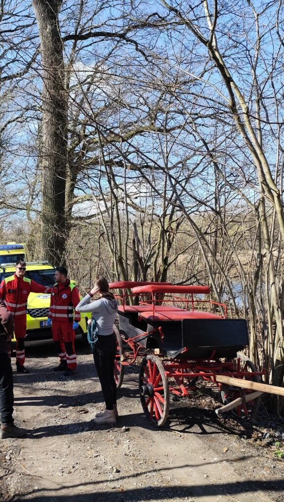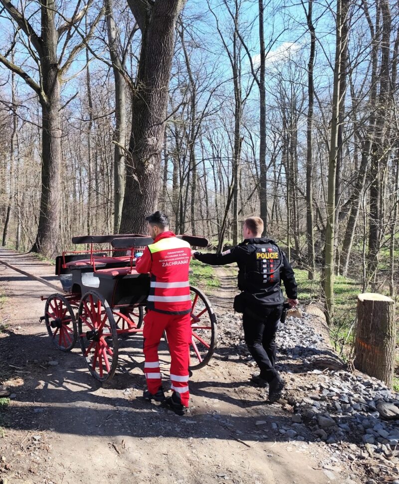 Jednašedesátiletý muž jel po lesní cestě na povozu, který byl tažen koněm. Zvíře se splašilo a povoz sjel do příkopy. Přitom došlo k pádu muže, jenž zůstal po nehodě několik minut v bezvědomí. Se záchranáři již později komunikoval, jevil však příznaky svědčící pro otřes mozku. Zasahující lékař rovněž zjistil poranění horní končetiny a vícečetné oděrky. Týmy ZZS poskytly pacientovi přednemocniční neodkladnou péči a poté jej transportovaly do nemocnice v Opavě, kde byl předán do péče zdravotníků chirurgické ambulance.