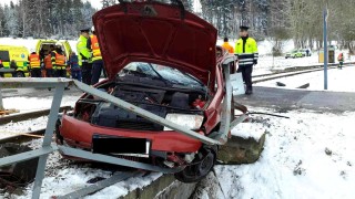 Do osobního auta narazil v úterý dopoledne vlak na železničním přejezdu Záhořice u Žlutic. Zdemolované auto zůstalo viset na železničním mostku za přejezdem, uvnitř pak po nárazu zůstaly zaklíněné tři osoby.