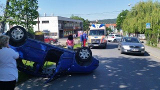 V pátek odpoledne přímo v centru Řevnic u prodejny potravin došlo k dopravní nehodě dvou osobních vozidel. Po střetu skončilo jedno z aut na střeše.