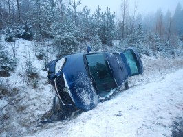 Při ranní havárii osobního vozu před Karlštejnem řidička nezvládla na kluzké vozovce řízení a sjela do příkopu, kde se auto převrátilo na střechu.