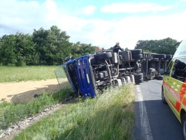 Do obce Kanice k dopravní nehodě kamionu vyslalo ve středečních ranních hodinách operační středisko hasiče k Domažlic. Kamion se převrátil na bok, kabinou skončil v přikopě, návěs zůstal ležet napříč vozovky. Z nákladového prostoru se vysypal na louku převážený ječmen.